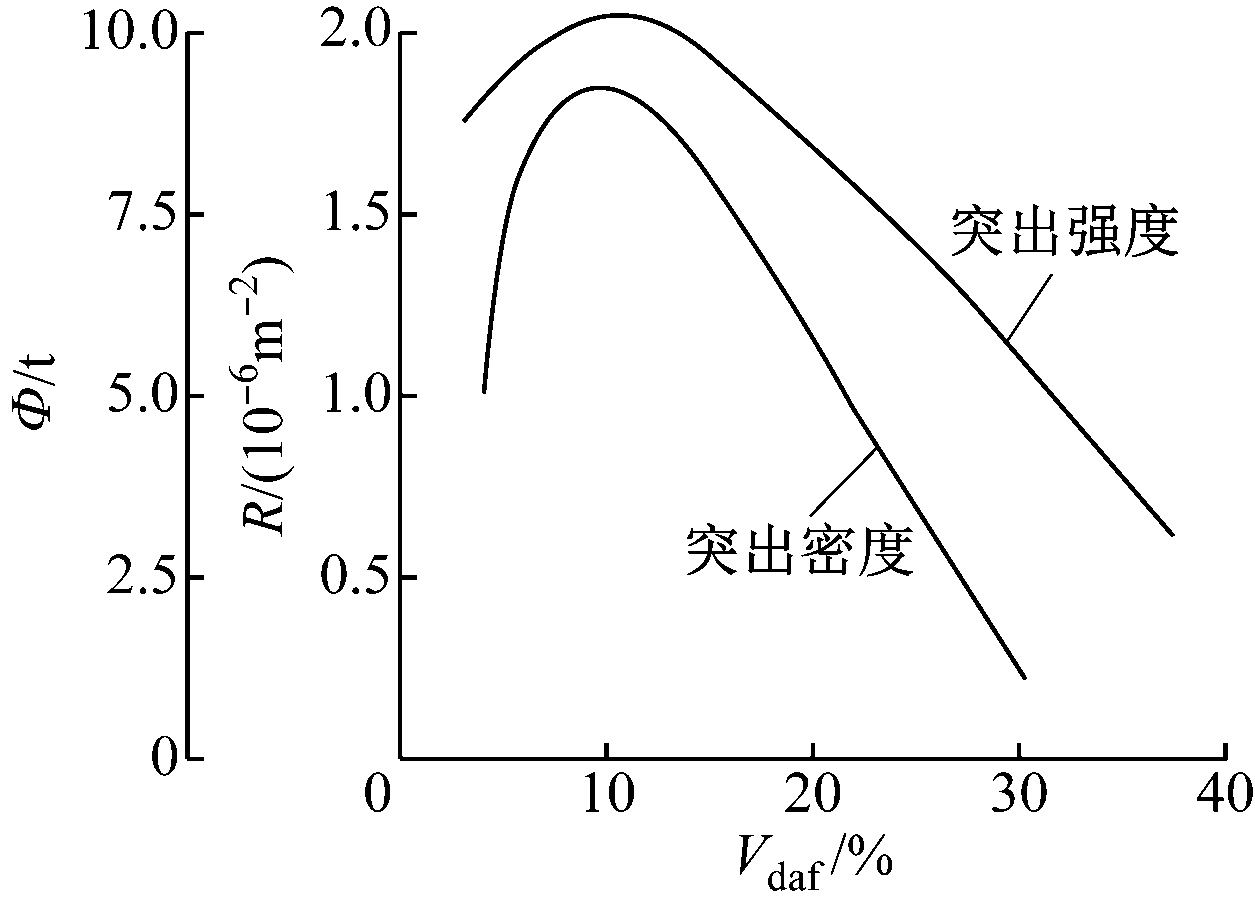 图3 突出密度R及单次突出事故强度Φ与煤体变质程度Vdaf之间的关系