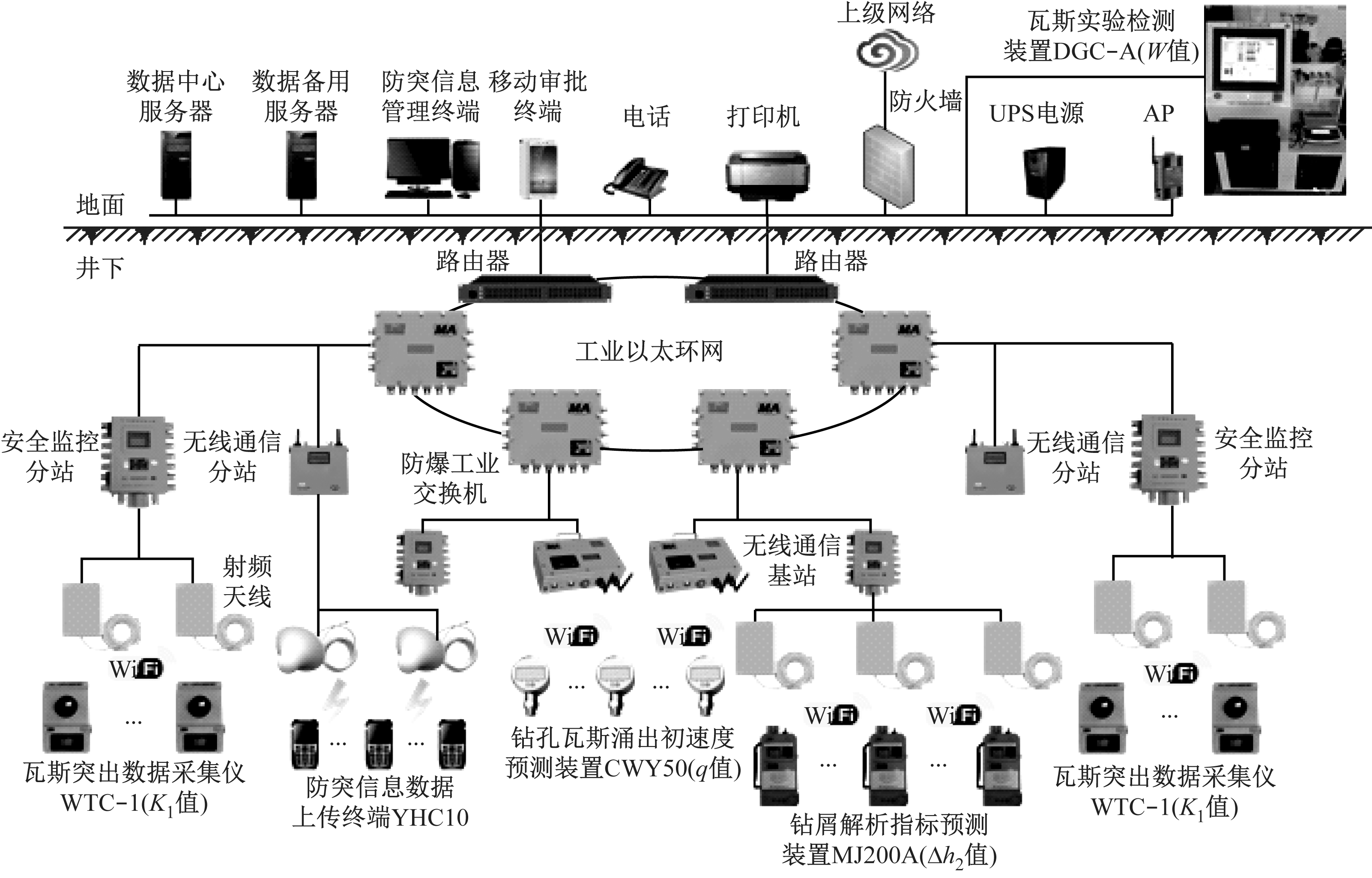 平台采用C/S软件开发框架结构,其架构如图6所示。平台井下部分包括防爆工业交换机、安全监控分站、无线通信分站、钻屑解析指标预测装置、钻孔瓦斯涌出初速度预测装置、工业以太环网及防突信息数据上传终端等;井上部分包括数据中心服务器、数据备用服务器、防突信息管理终端、移动审批终端、UPS电源、防火墙及瓦斯实验检测装置等。数据中心服务器安装在矿井中心机房内,应用终端软件安装在瓦斯实验室、调度中心及其他业务管理部门。