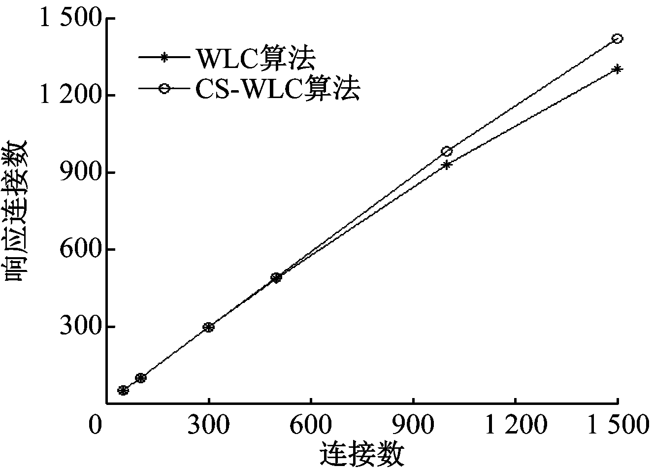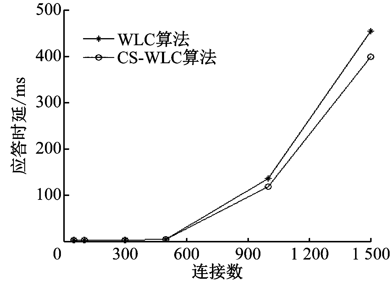 试验结果如图2所示。可看出在融合性监控系统数据量不断增加的情况下,CS-WLC算法在数据匹配方面有明显优势:在连接数为1 000时,采用CS-WLC算法时系统应答时延比采用WLC算法时降低了12.997%,响应连接数提高了5.61%;在连接数为1 500时,采用CS-WLS算法时系统应答时延比采用WLS算法时降低了13.829%,响应连接数提高了9.15%。
