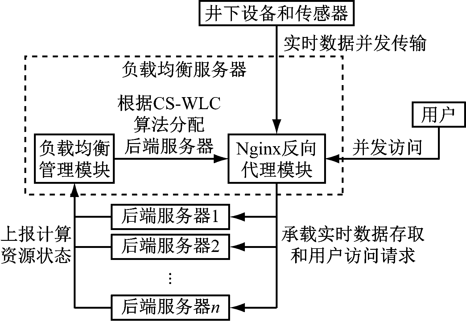 智慧矿山软件平台整体部署如图1所示。各后端服务器承载数据存取及用户访问业务功能。前端负载均衡服务器内置负载均衡管理模块和Nginx反向代理模块,前者用于判别后端服务器运行情况,后者根据前者判别结果将实时数据存取和用户访问请求分配给当前负载较轻的后端服务器。