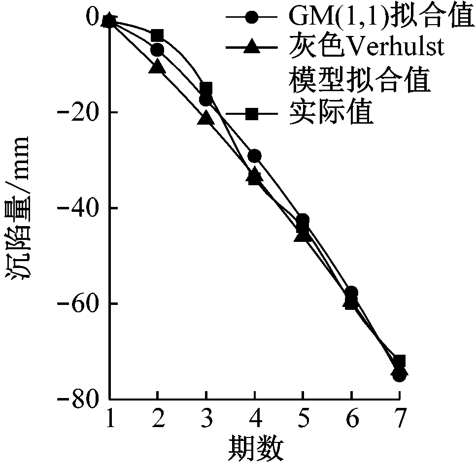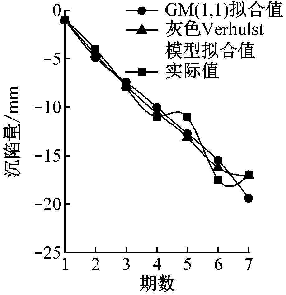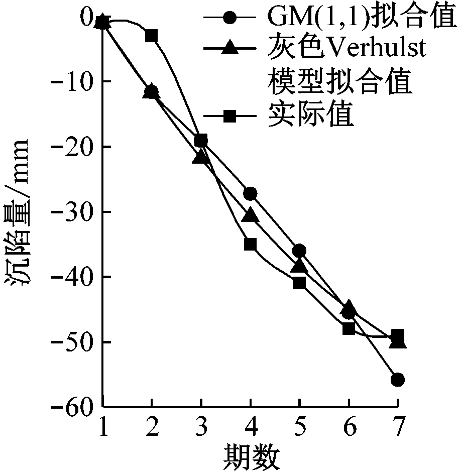 (1) 从图5(a)、图5(b)可看出,实际沉陷量曲线后期呈平底饱和状态,此时GM(1,1)和灰色Verhulst模型前期(1,2,3期)拟合结果差别不大,但后期(4—7期)灰色Verhulst模型较GM(1,1)收敛快,拟合结果与实际沉陷量吻合较好。图5(c)中实际沉陷量曲线后期包含非单调摆动过程,使用GM(1,1)拟合误差较大。图5(d)、图5(e)中实际沉陷量曲线呈近似单峰型,GM(1,1)拟合曲线更接近实际值,且后期GM(1,1)和灰色Verhulst模型拟合结果相差不大。