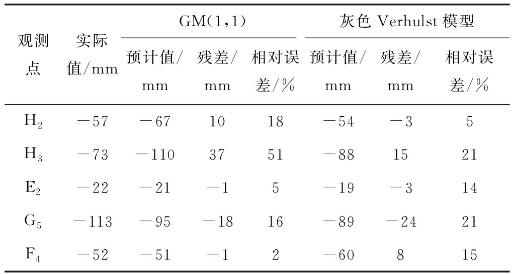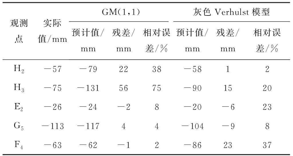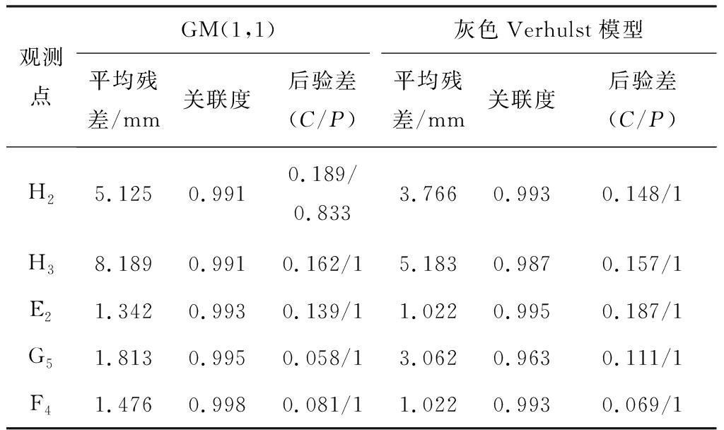 (2) 从表2可看出,观测点H2,H3使用灰色Verhulst模型拟合结果明显优于GM(1,1),平均残差分别减小了约26.5%,36.7%。根据后验差精度等级(表5),观测点H2的GM(1,1)拟合结果只能达到合格,而其灰色Verhulst模型拟合结果精度等级达到良好;观测点G5采用GM(1,1)拟合时平均残差较灰色Verhulst模型减小了1.249 mm,关联度提高了约3.2%;观测点E2,F4采用2种GM拟合的效果相近,精度等级均达到良好,且平均残差之差均小于1 mm。