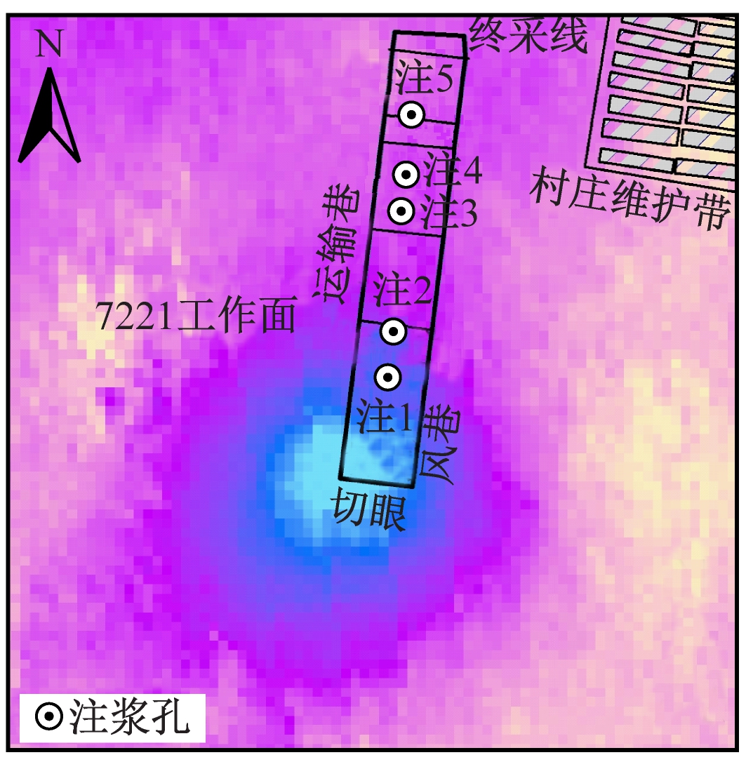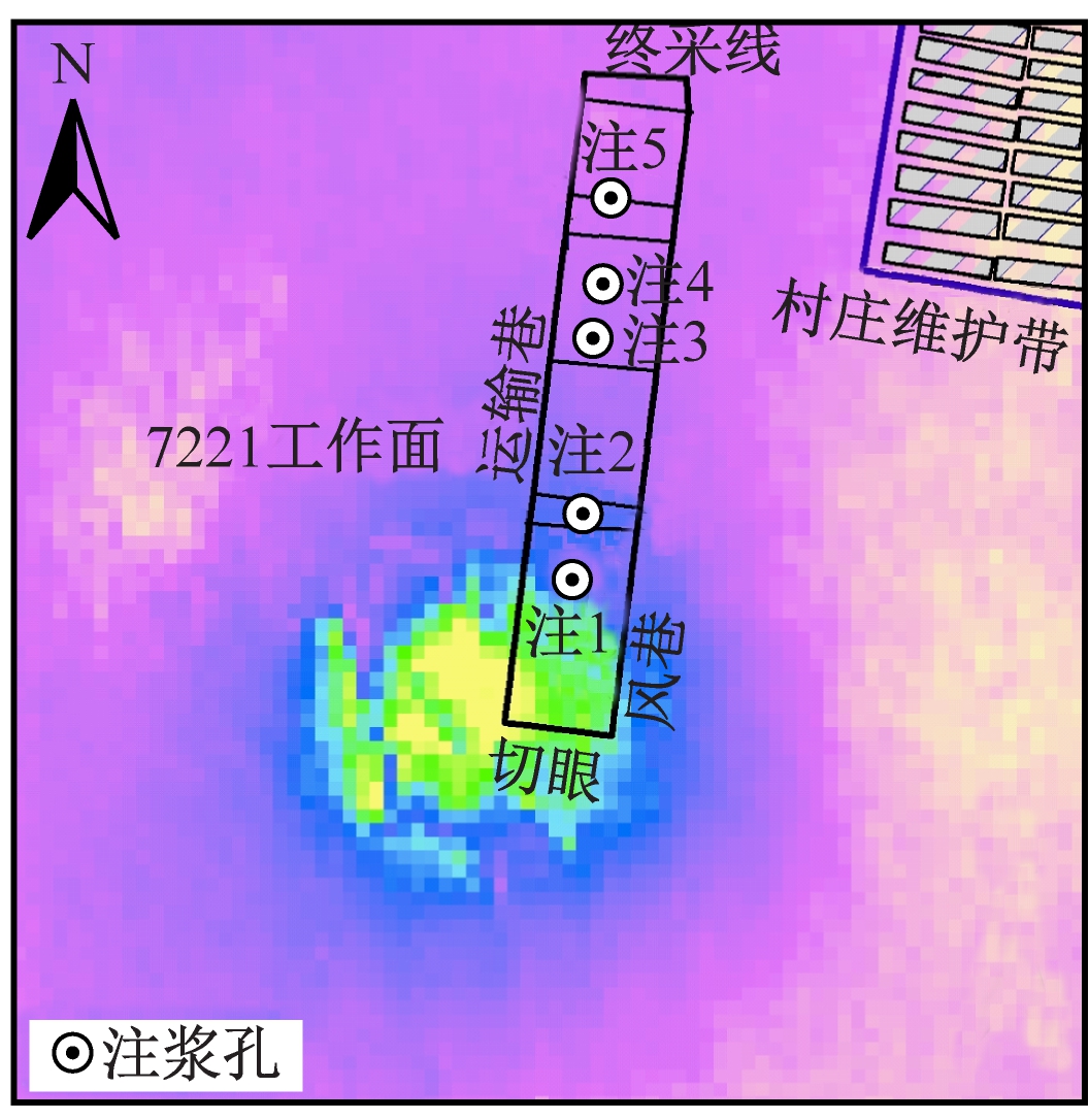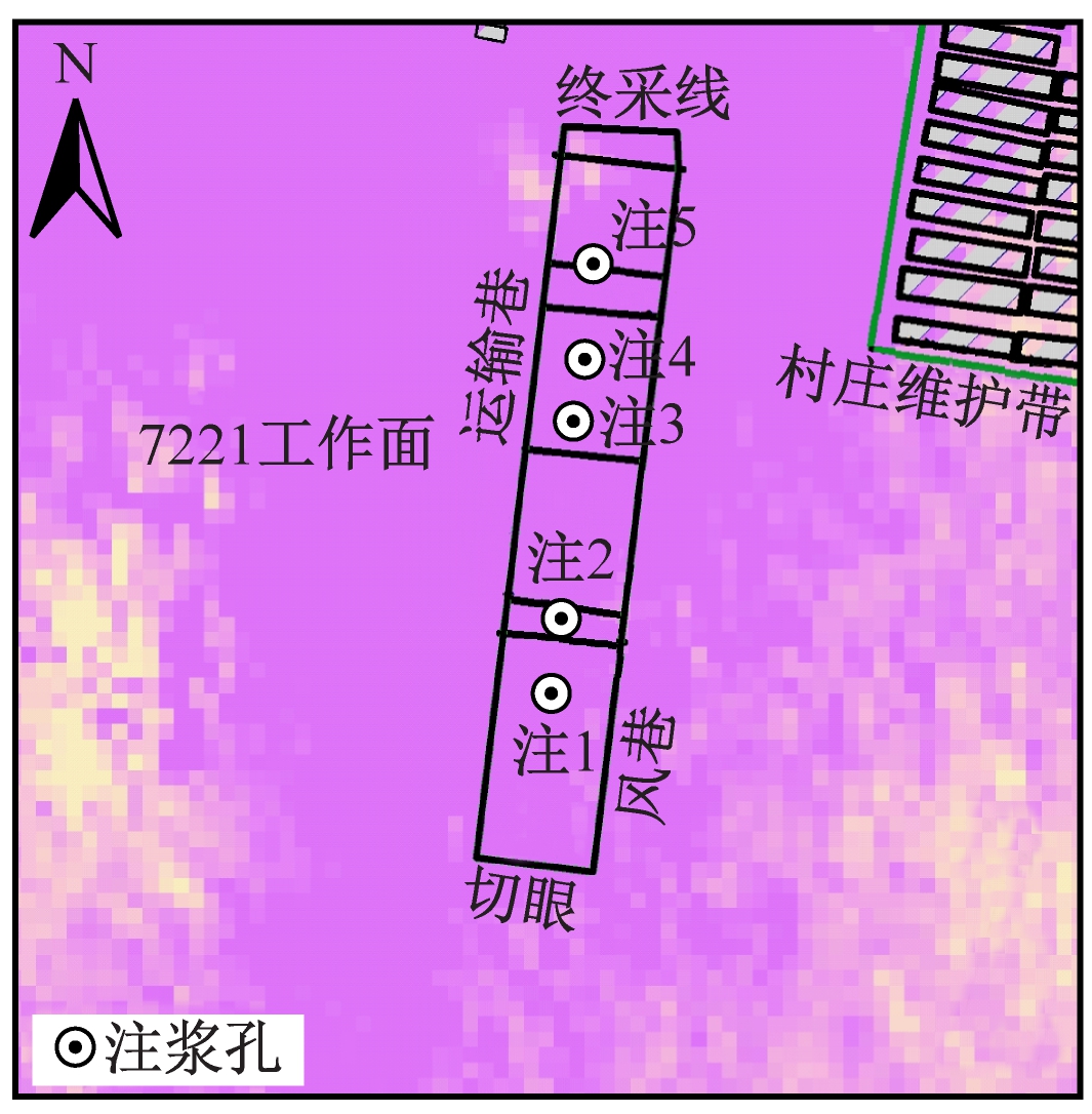袁店二矿7221工作面上方地表主要覆盖物为村庄和农田,四邻无其他采掘活动。该工作面为俯斜开采,工作面宽约110 m,走向长约544 m,煤层倾角为10~20°,基岩厚度为132~162 m,采高为4.5 m,于2017-12-06开始回采,2018-06-03停采。为了控制地表采动损害在建筑物等安全保护等级范围之内,分别在地表公路或建筑体上设置水准测量与变形监测点,以监测地表及重要建筑物变形情况。但该区域内人工沟渠纵横分布,监测点稀少、空间配置不合理且常被人为破坏,无法准确对重要建筑物进行损害评估。因此,有必要在工作面开采过程中对该区域进行地表沉陷D-InSAR监测。