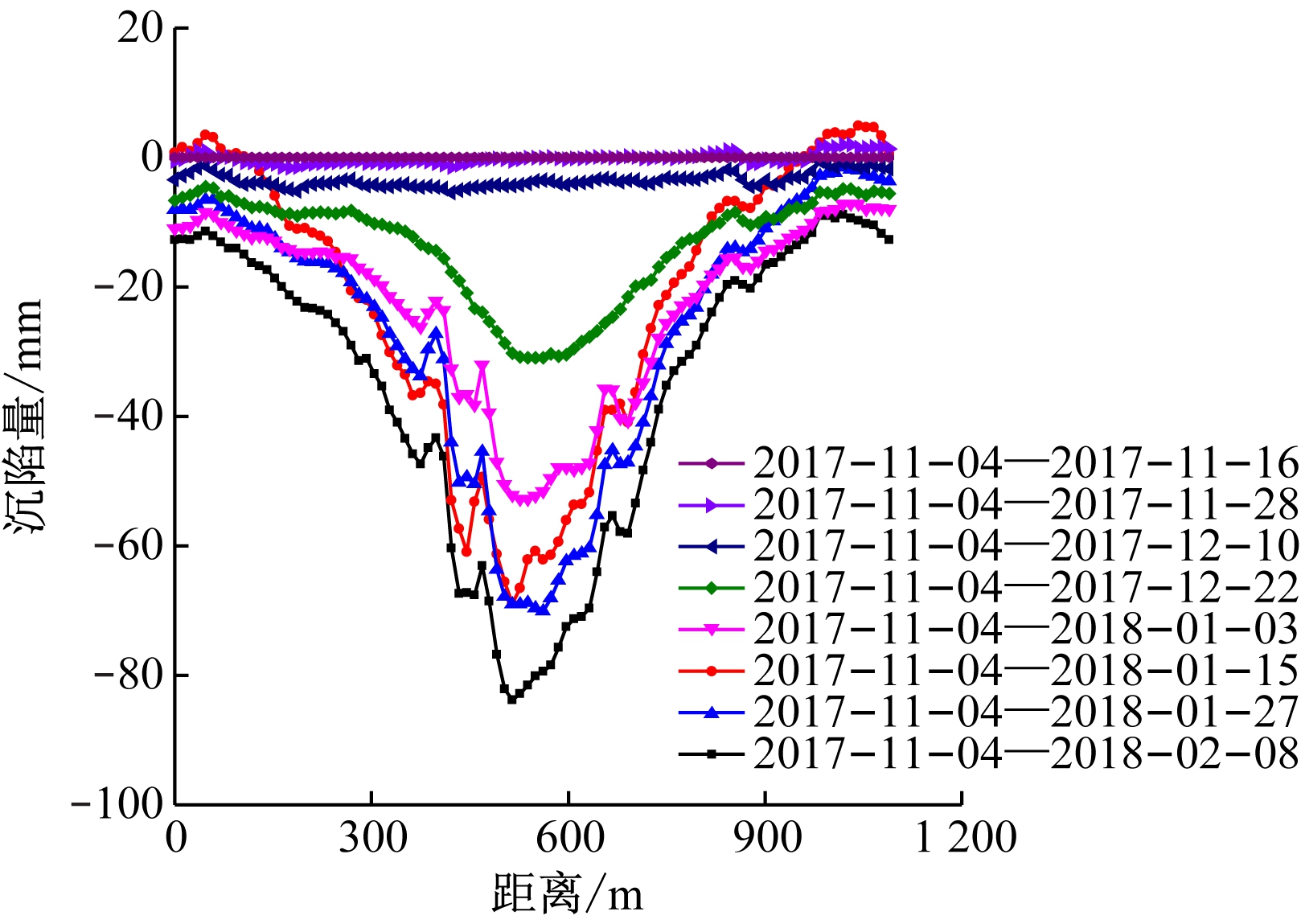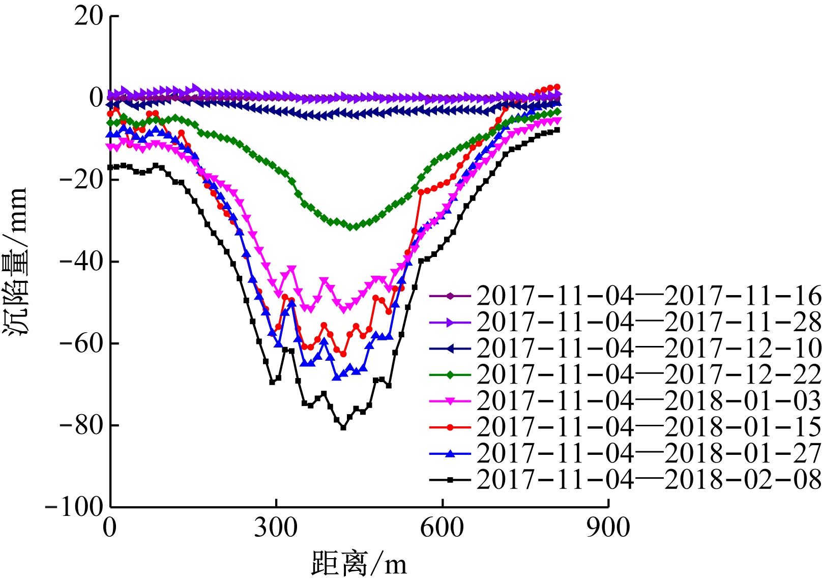 为更好地对D-InSAR监测结果进行定量研究,提取下沉盆地中沿7221工作面倾向l1和走向l2(l1,l2位置如图2所示)的沉陷剖面线,如图3所示。l1长807 m,方向为自西向东,设其最西端为零点;l2长1 089 m,方向为自南向北,设其最南端为零点。从图3(a)可看出,2017-11-04—2018-02-08,l1最大沉陷量为-81 mm,2017-11-28—2018-01-03沉陷剖面线变陡,沉陷量显著增大,后期进入沉陷衰减阶段,开始微小沉陷。从图3(b)可看出,2017-11-04—2018-02-08,l2最大沉陷量为-84 mm,2017-11-28—2018-01-03沉陷速度较快,动态最大沉陷量不断增加,2018-01-03—02-08沉陷速度开始衰减,但平面影响范围不断增大。对比图3(a)和图3(b)可看出,开采对倾向沉陷影响范围小于走向,且倾向沉陷阶段发育早于走向,下沉盆地近似出现平底状态。