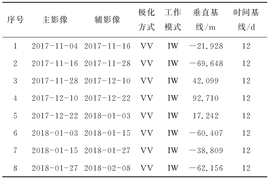 为了尽可能减少D-InSAR技术相位失相干对地表沉陷监测结果精度的影响,选取冬季和初春时段(该时段植被萧疏且地物波谱特征无明显变化)的9景哨兵卫星(Sentinel-1A)雷达影像作为D-InSAR监测的数据源。影像时间为2017-11-04—2018-02-08,相邻时间间隔(12 d)的影像可以形成8个干涉对,见表1,其中VV为同向垂直极化方式,IW为干涉测量宽幅模式。外部数字高程模型选用分辨率为90 m的SRTM(Shuttle Radar Topography Mission,航天飞机雷达地形测绘使命)数据。