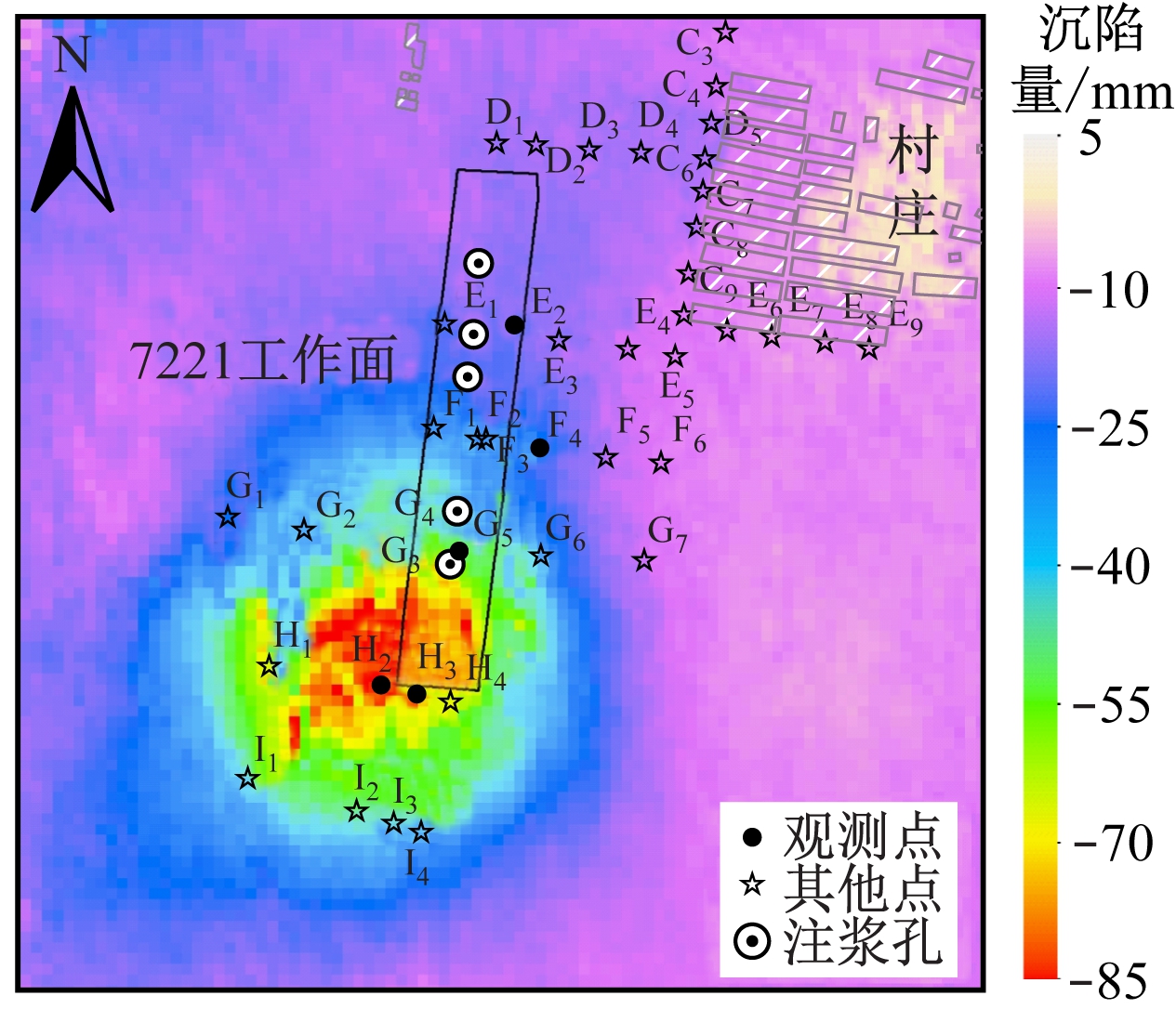 根据表1数据,利用D-InSAR技术二轨法获取8组7221工作面时间序列沉陷分布。为方便分析,以2017-11-04雷达影像为参考对象,将各组沉陷量依次累加,即可得到各组时间序列沉陷分布。由于2017-11-04—28地形无明显变化,所以仅给出后6组时间序列沉陷分布,如图1所示。可看出在回采初期(2017-12-06—10),沉陷量为-10~0 mm。随着工作面推进,进入沉陷发展阶段(图1(b)—图1(f)),在2017-12-22开始形成下沉盆地,与7221工作面推进方向一致。下沉盆地自西南向东北方向扩张,沉陷量和平面范围随之增大。至2018-02-08,最大沉陷量为-85 mm,位于7221工作面切眼附近,离注浆孔(注3、注4、注5,位于工作面东北部)较近的村庄未发生明显沉陷,说明注浆充填开采工艺有很好的局域减沉效果。