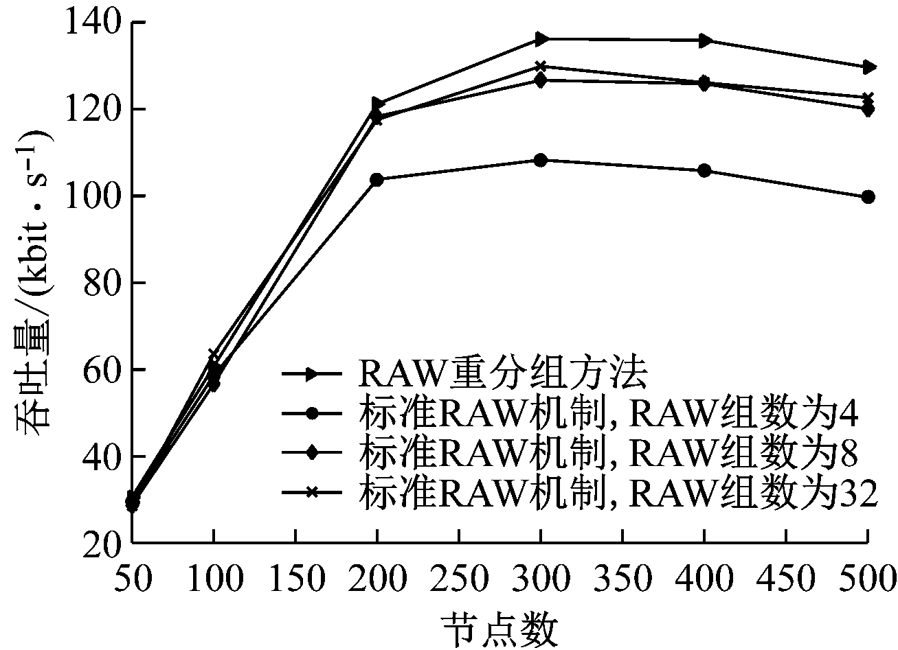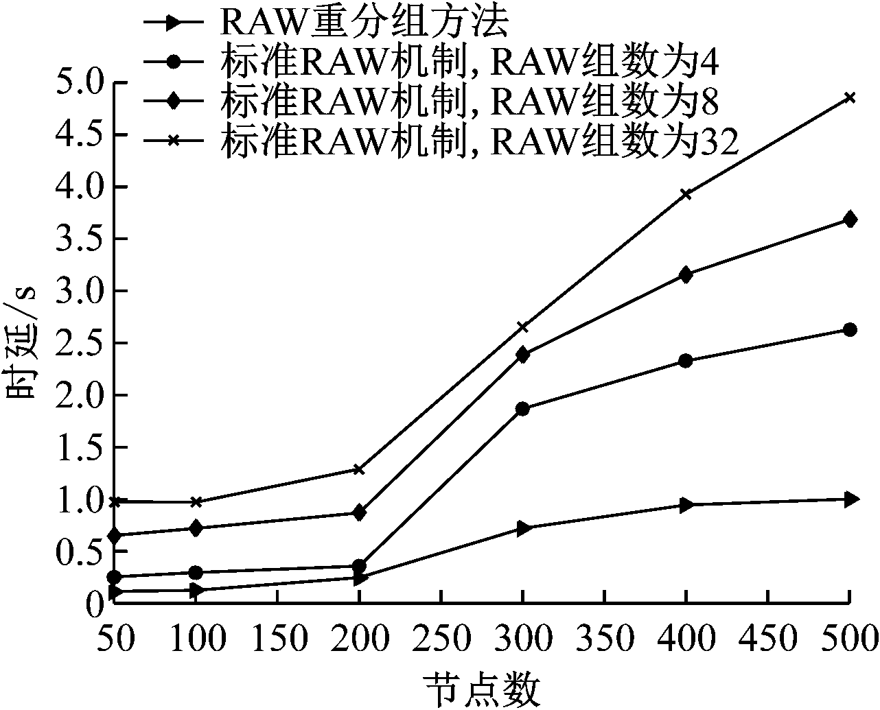 从图7可看出:当节点不超过200个时,由于节点间数据碰撞较少,RAW重分组方法和标准RAW机制的吞吐量相差不大;对于标准RAW机制,当节点超过200个时,节点间数据碰撞严重,RAW组数越多则数据碰撞越少,吞吐量越高,但其增高受到一定限制,如RAW组数为8,32时吞吐量基本相等,此时RAW组数不是影响吞吐量的主要因素;当节点超过200个时,RAW重分组方法的吞吐量较标准RAW机制优势明显,如400个节点情况下较RAW组数为32时提高了7.6%。