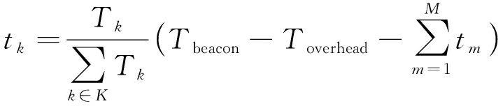 式中:Tk为第k个初始RAW组中剩余节点预计传输时间;Tbeacon为信标间隔;Toverhead为Tbeacon内传输控制等信息所用的时间开销。