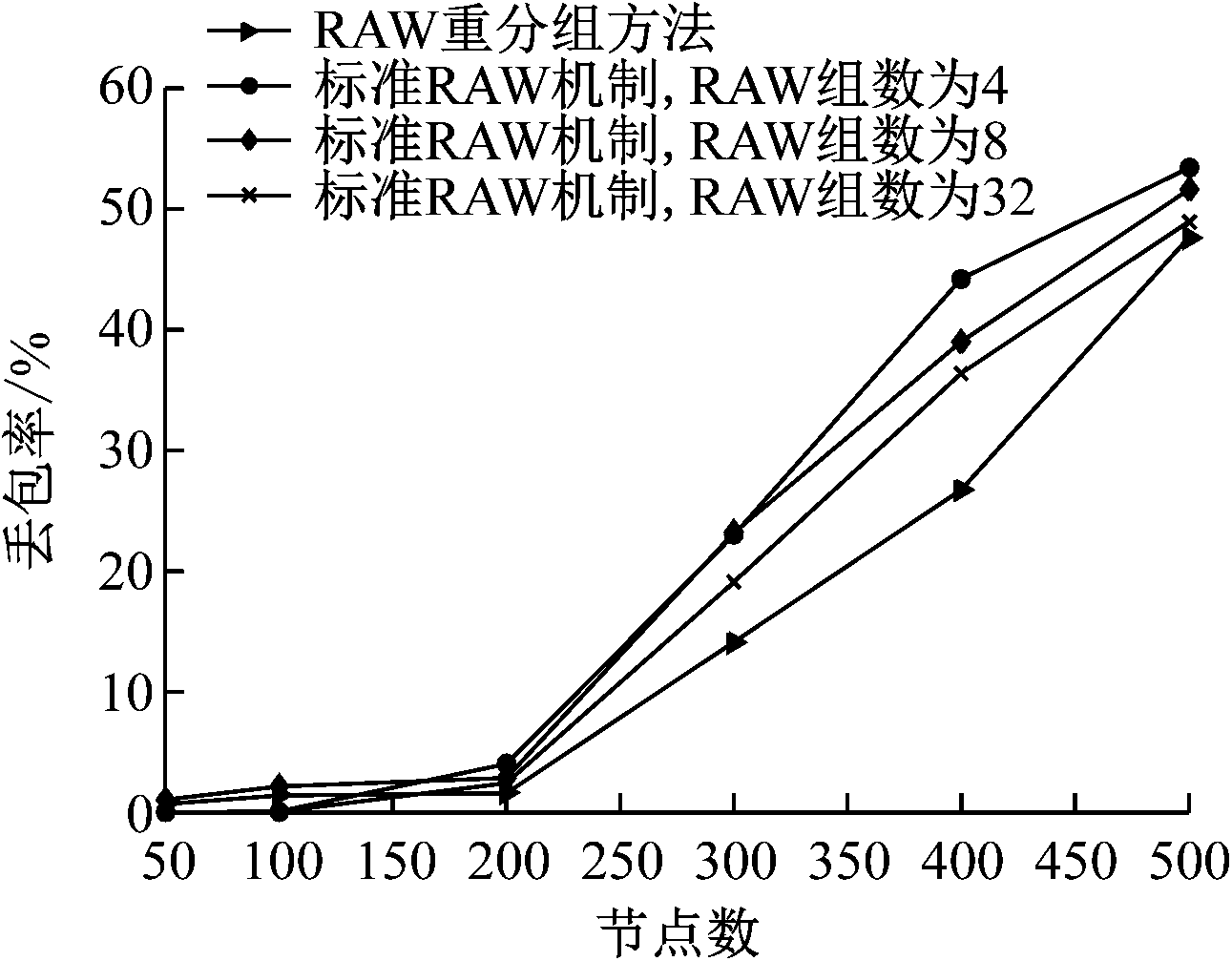 从如图8可看出:当节点不超过200个时,RAW重分组方法和标准RAW机制的丢包率基本相等且变化不大;当节点超过200个时,丢包率因碰撞加剧而逐渐增大;对于标准RAW机制,在节点数大于200情况下,RAW组数为4时丢包率较大,原因是节点较多时,在单个RAW组内仍存在节点间数据碰撞,而RAW组数为8,32时丢包率相差不大,表明此时RAW组数对丢包率影响较小;当节点超过200个时,RAW重分组方法的丢包率小于标准RAW机制,如400个节点情况下较RAW组数为32时降低了26.5%。