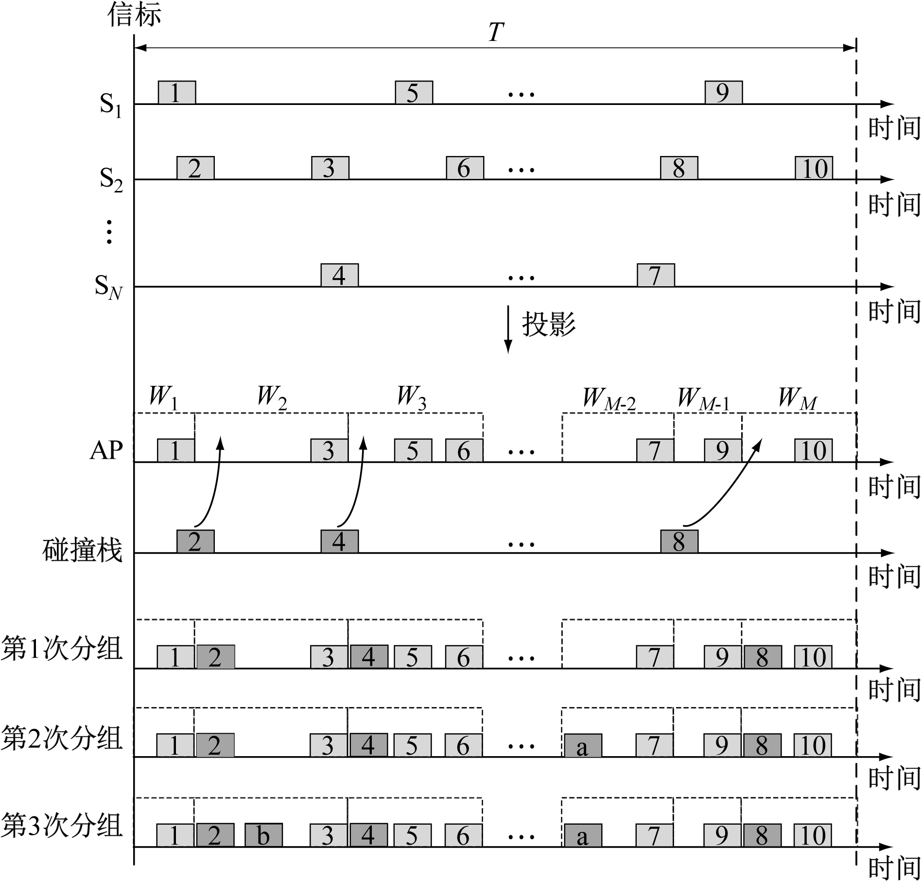 (6) 第2次分组完成后,检查碰撞栈中是否还存在碰撞数据包,若有则开始第3次分组。根据预计传输时间计算每个RAW组经2次分组后可用空闲时间Δi-1,将Δi-1>1的RAW组按可用空闲时间大小降序排序,依次从碰撞栈中随机获取碰撞数据包(如图2中数据包b)并安排分组,直至RAW组可用空闲时间用完,不够安排1个数据包传输。此时信道已饱和,将碰撞栈中仍存在的数据包丢弃。随机选择传输碰撞数据包可避免在信道饱和情况下个别节点的数据包始终无法传输。