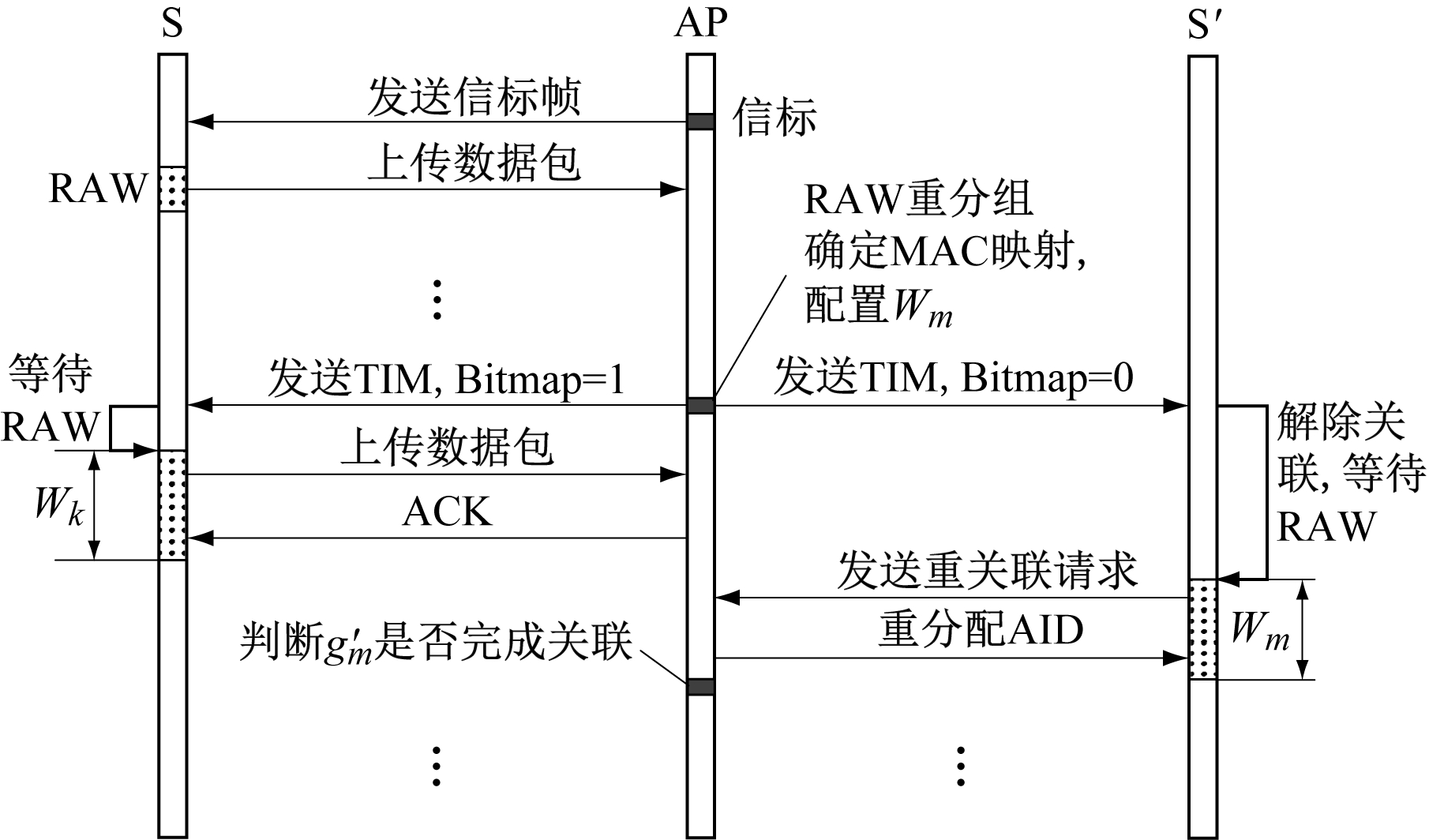 内节点关联,取消节点MAC地址与原AID的对应关系。通过信标帧中TIM(Traffic Indication Map,流量指示图)的位图(Bitmap)信息指示解除关联的节点,即位图中“0”所对应AID的节点。其他关联节点仍在原RAW组内传输数据,如图3所示,其中S′表示