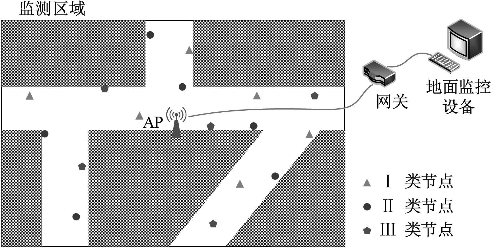 本文研究的井下监测传感网模型如图1所示。该网络中存在N个不同类型(I,II,III)的传感节点,如有害气体浓度传感节点、震动传感节点、压力传感节点等。所有节点支持IEEE 802.11ah协议。假设各类传感节点采样间隔不同,采样数据包大小相同,且周期性地向AP发送采样数据包。AP汇聚数据包后通过网关传送给地面监控设备。网络中传感节点位置固定,采用单AP负责处理一定范围内传感节点数据。