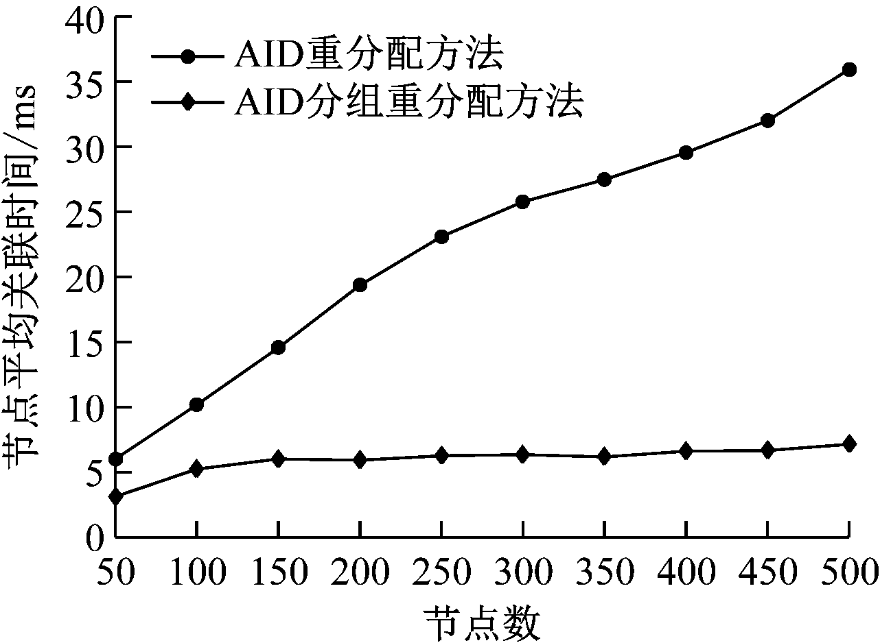 采用AID分组重分配方法和AID重分配方法时监测传感网的信道利用率(业务数据包传输所用时间与总信道可用时间的比值)和节点平均关联时间分别如图4、图5所示。在10.5 s时对50个节点进行RAW重分组,重分组前后RAW组均为8个。从图4可看出:AID重分配方法在RAW重分组过程中信道利用率为0,导致所有节点在该时间段内采样数据包丢失,网络传输性能严重下降;而AID分组重分配方法虽略微延长了RAW重分组时间,但该时间段内信道利用率仅降低10%左右,对网络传输性能影响较小。从图5可看出,AID分组重分配方法因采用分RAW组重关联代替集中重关联,节点关联AP时间大幅降低,当网络中有500个节点时,节点平均关联时间仅为AID重分配方法的1/5左右,提高了RAW重分组过程中的网络性能。