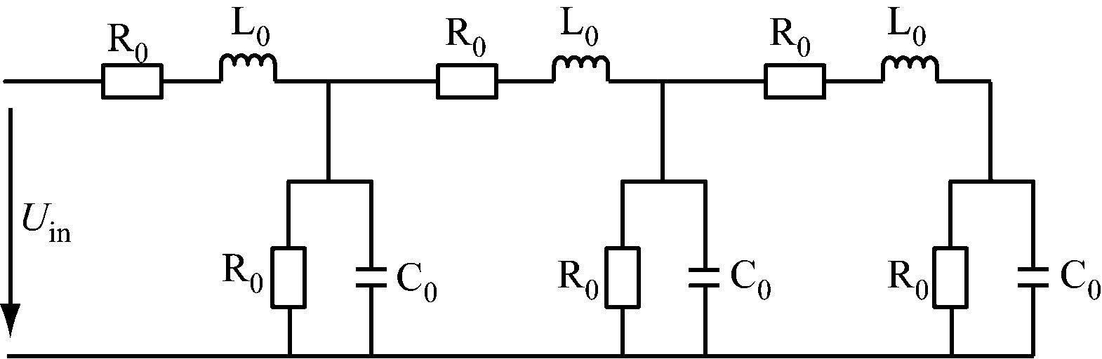 长线电缆等效电路如图1所示,其中Uin为长线电缆输入电压,R0为单位长度电缆的分布电阻,L0为单位长度电缆的电感,C0为单位长度电缆的电容。由图1可知,均匀无损耗电缆的特性阻抗Z0为[8]