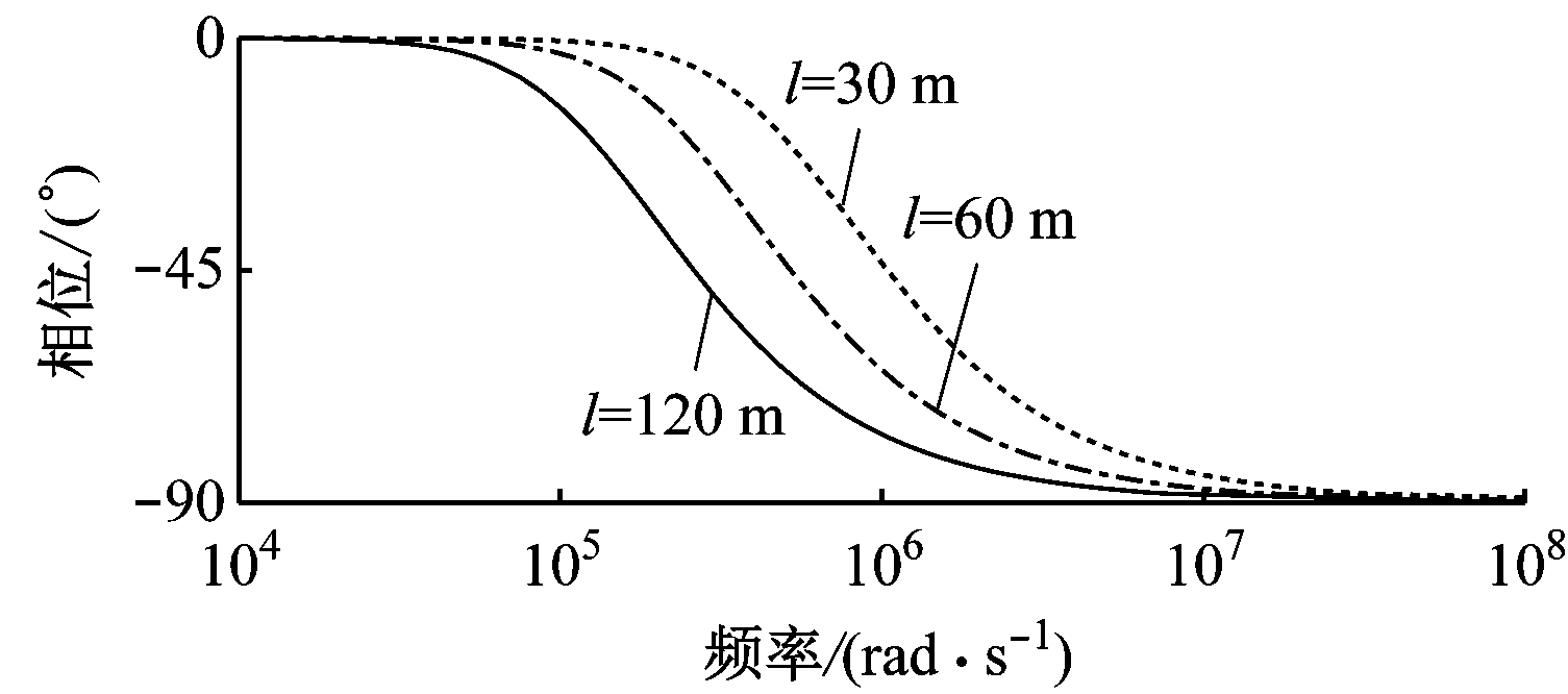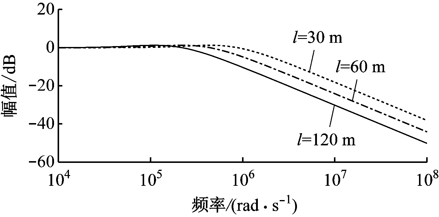 滤波参数的最优解与电缆长度相关。分别取电缆长度l为30,60,120 m,取电动机负载时的反射系数ΓL=0.9,LRC滤波装置传递函数的伯德图如图6所示。