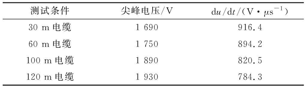 测试条件尖峰电压/Vdu/dt/(V·μs-1)30 m电缆1 690916.460 m电缆1 750894.2100 m电缆1 890820.5120 m电缆1 930784.3