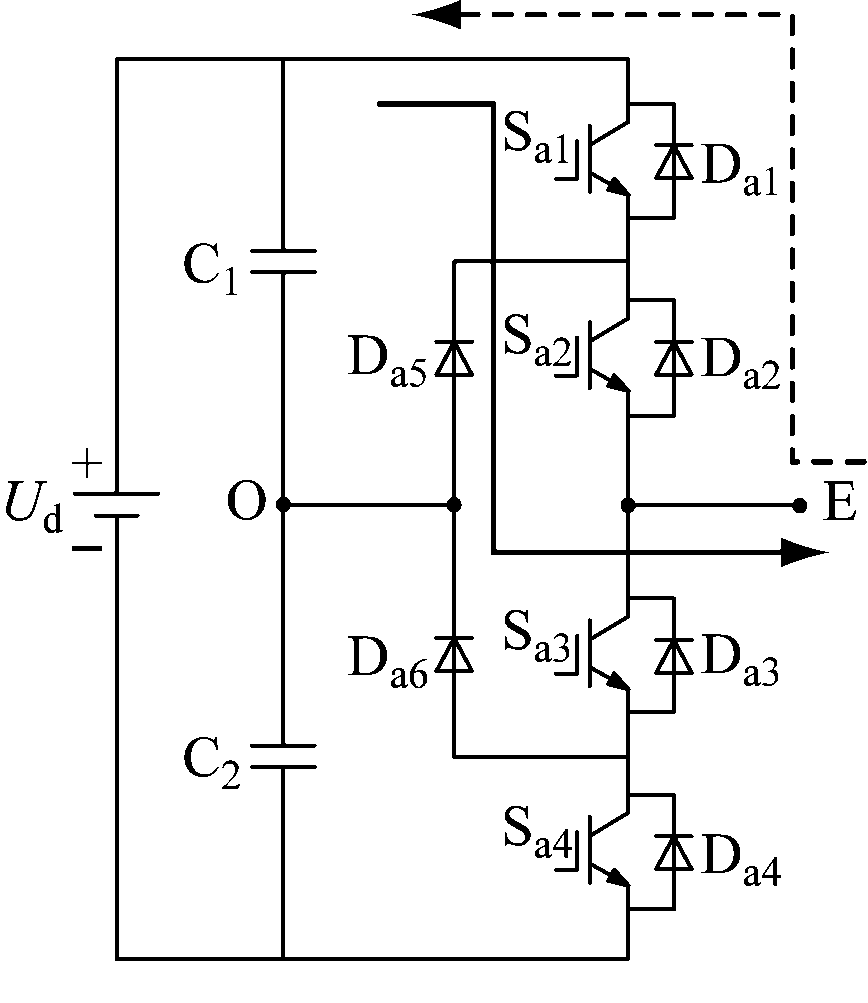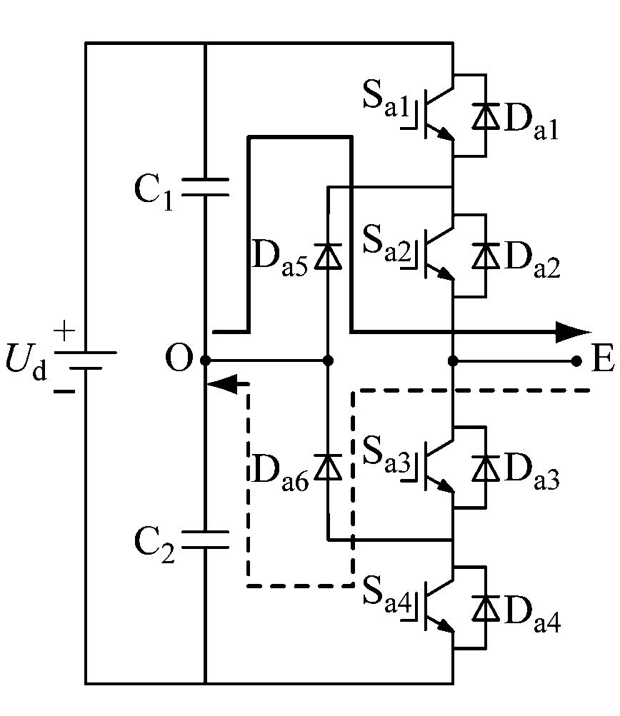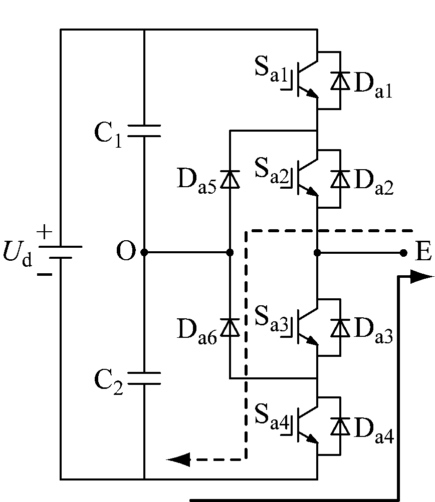 (2) 零电平状态:Sa2,Sa3导通,Sa1,Sa4关断,A相输出电压为零。正电流依次经过Da5,Sa2流向电动机;负电流依次经过Sa3和钳位二极管Da6流入逆变器。不考虑功率管上的压降,E点相对于O点的电势差为0。