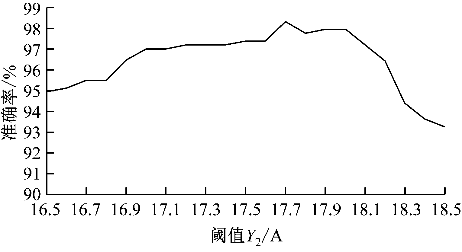 为了验证阈值Y2取值的合理性,在16.5~18.5 A之间,以步长0.1 A取不同的阈值进行实验。利用迭代法对533个样本进行21次迭代,并计算故障诊断准确率,结果如图6所示。