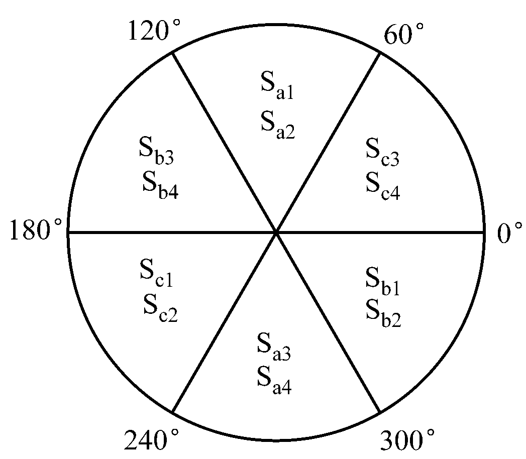 NPC三电平逆变器IGBT的13种故障通过平均电流Park矢量的模和相角进行区分。具体故障诊断步骤:① 设定阈值Y1,当Park矢量模值大于Y1时,判断功率管故障。② 根据图4确定Park 矢量相角所属区域。③ 设定阈值Y2,判断Park矢量模值与Y2的大小关系,进而定位故障功率管。