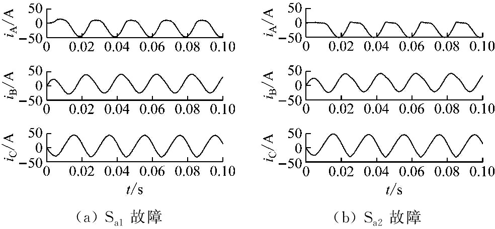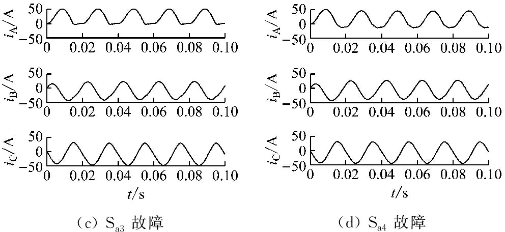 从图3可知,B,C两相的输出电流波形变化很小,而A相输出电流变化较大。当Sa1故障时,A相输出电流的正半周幅值下降了近50%,负半周幅值保持不变;当Sa2故障时,A相输出电流的正半周幅值几乎为0,负半周幅值保持不变;当Sa3故障时,A相输出电流的正半周幅值保持不变,负半周幅值几乎为0;当Sa4故障时,A相输出电流的正半周幅值保持不变,负半周幅值下降了近50%。由此可以发现,当某一IGBT发生开路故障时,1个周期内的输出电流平均值不再为零。