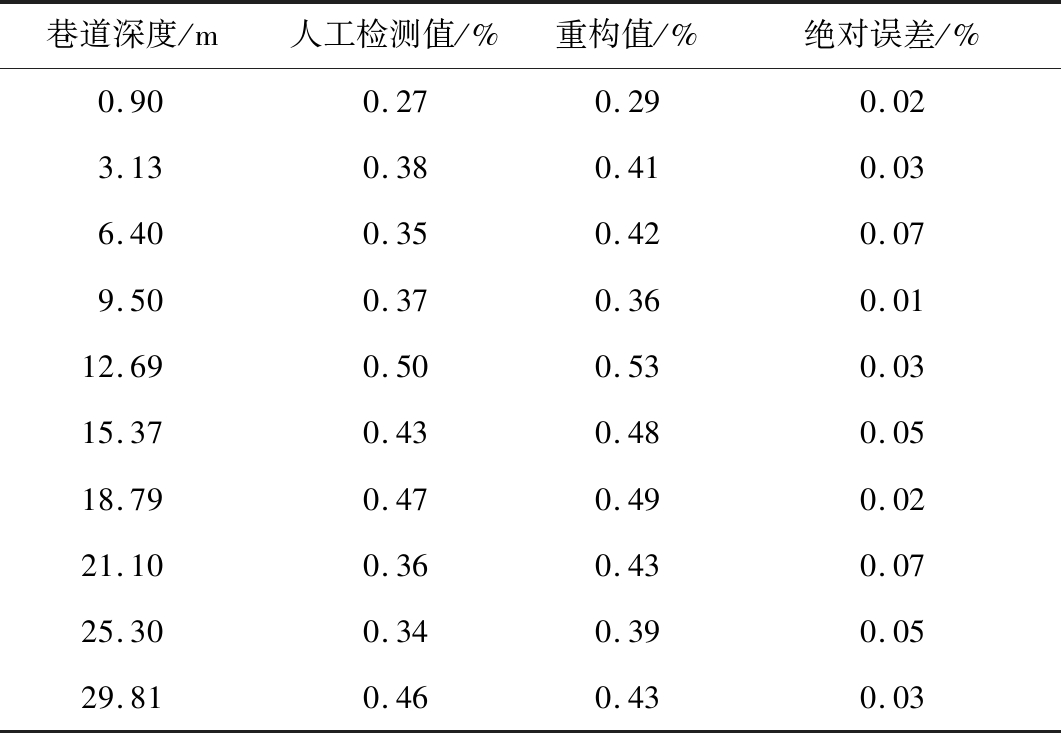 巷道深度/m人工检测值/%重构值/%绝对误差/%0.900.270.290.023.130.380.410.036.400.350.420.079.500.370.360.0112.690.500.530.0315.370.430.480.0518.790.470.490.0221.100.360.430.0725.300.340.390.0529.810.460.430.03