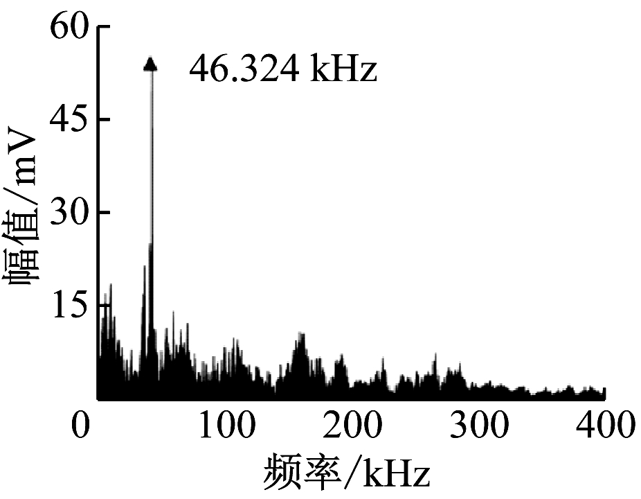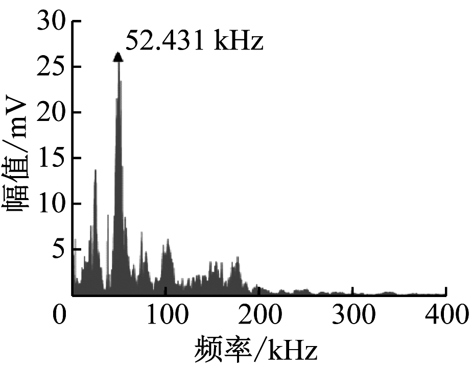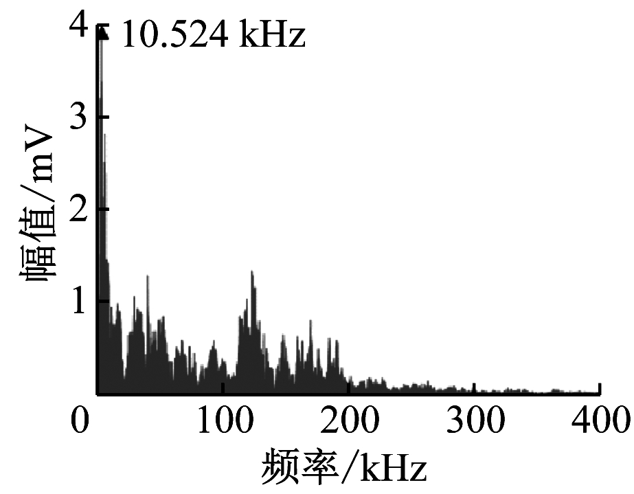 采用快速傅里叶变换将声电信号从时域转换到频域,其中加速破坏和完全破坏阶段声电信号频谱如图4和图5所示。从信号频带来看,声发射信号频带为0~400 kHz,石灰岩、页岩试样电磁辐射信号频带分别为0~100 kHz和0~40 kHz,声发射信号频带比电磁辐射信号频带更宽,岩石破坏过程的电磁辐射信号以低频和甚低频信号为主;从信号主频集中范围来看,声发射信号主频集中在0~15 kHz和40~60 kHz,电磁辐射信号主频集中在0~10 kHz和50~60 kHz,声电信号主频集中范围相近但不完全一致,这是由于声电信号产生机理并不完全相同;从主频幅值来看,声发射信号主频幅值大于电磁辐射信号主频幅值,完全破坏阶段声电信号主频幅值大于加速破坏阶段声电信号主频幅值。