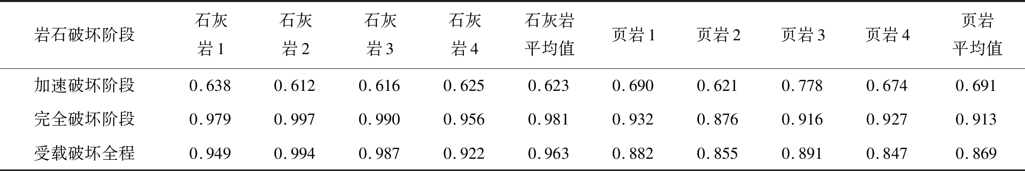 岩石破坏阶段石灰岩1石灰岩2石灰岩3石灰岩4石灰岩平均值页岩1页岩2页岩3页岩4页岩平均值加速破坏阶段0.6380.6120.6160.6250.6230.6900.6210.7780.6740.691完全破坏阶段0.9790.9970.9900.9560.9810.9320.8760.9160.9270.913受载破坏全程0.9490.9940.9870.9220.9630.8820.8550.8910.8470.869