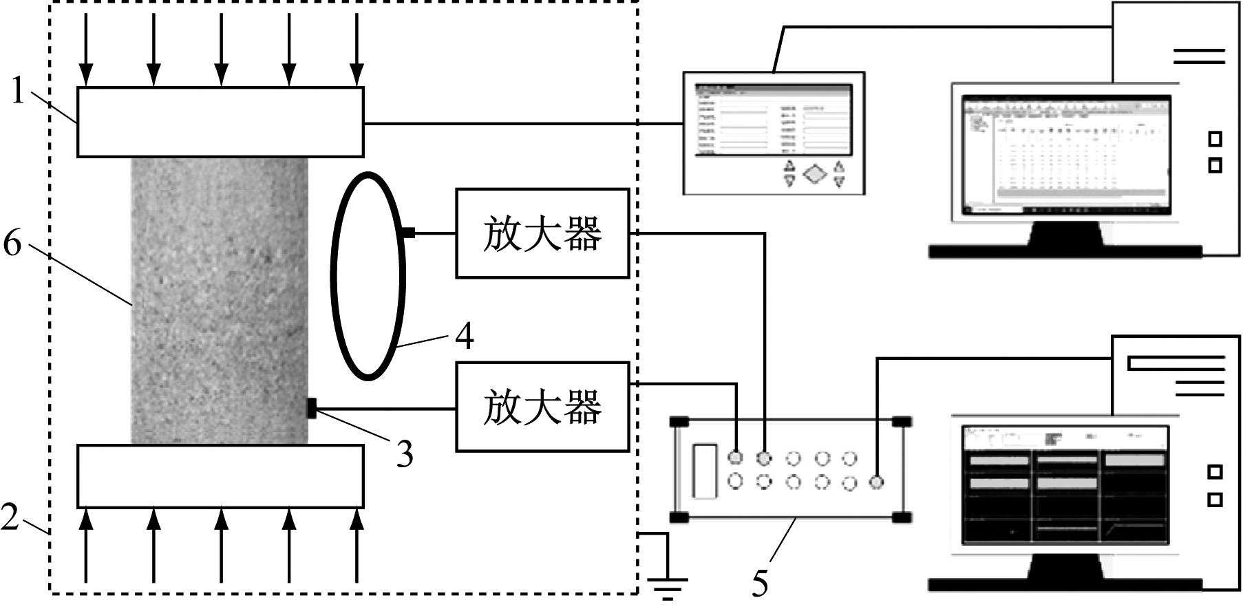 1—压力机;2—电磁屏蔽室;3—声发射传感器;4—电磁辐射线圈;5—数据采集系统;6—试样。