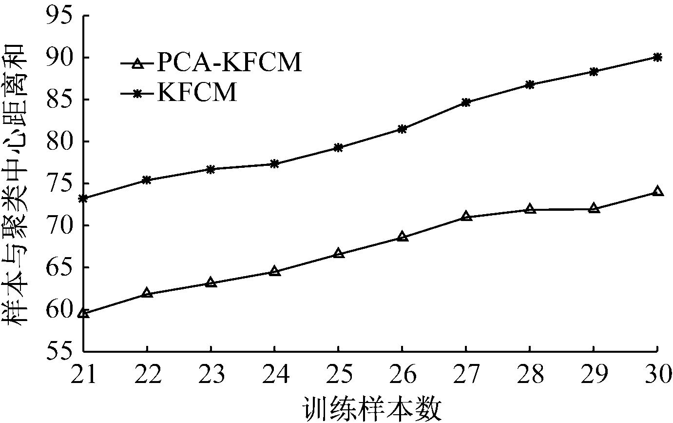 同理,通过不同数量的训练样本对2种算法进行研究,并对测试样本进行识别,PCA-KFCM算法的识别正确率均为100%;当训练样本数量为21和22时,KFCM算法的识别正确率为90%,其余识别正确率为100%,2种算法的训练样本与聚类中心的距离和比较结果如图4所示。
