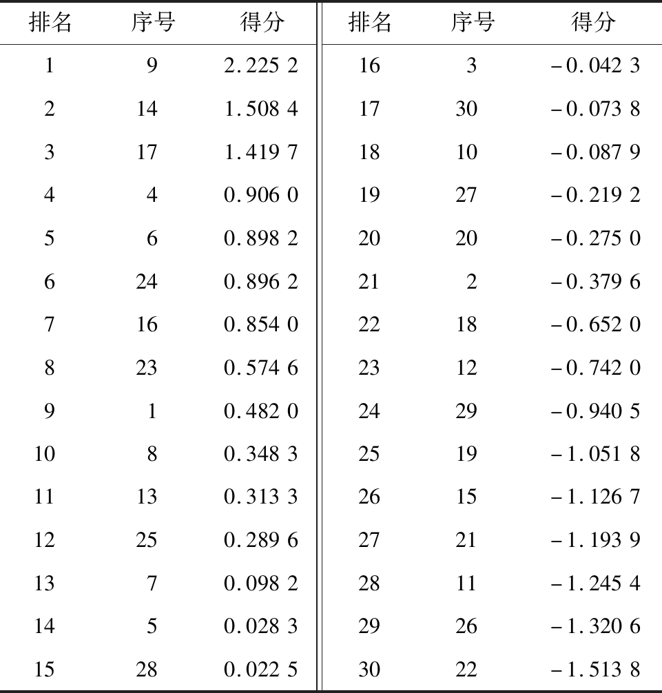 排名序号得分排名序号得分192.2252163-0.04232141.50841730-0.07383171.41971810-0.0879440.90601927-0.2192560.89822020-0.27506240.8962212-0.37967160.85402218-0.65208230.57462312-0.7420910.48202429-0.94051080.34832519-1.051811130.31332615-1.126712250.28962721-1.19391370.09822811-1.24541450.02832926-1.320615280.02253022-1.5138