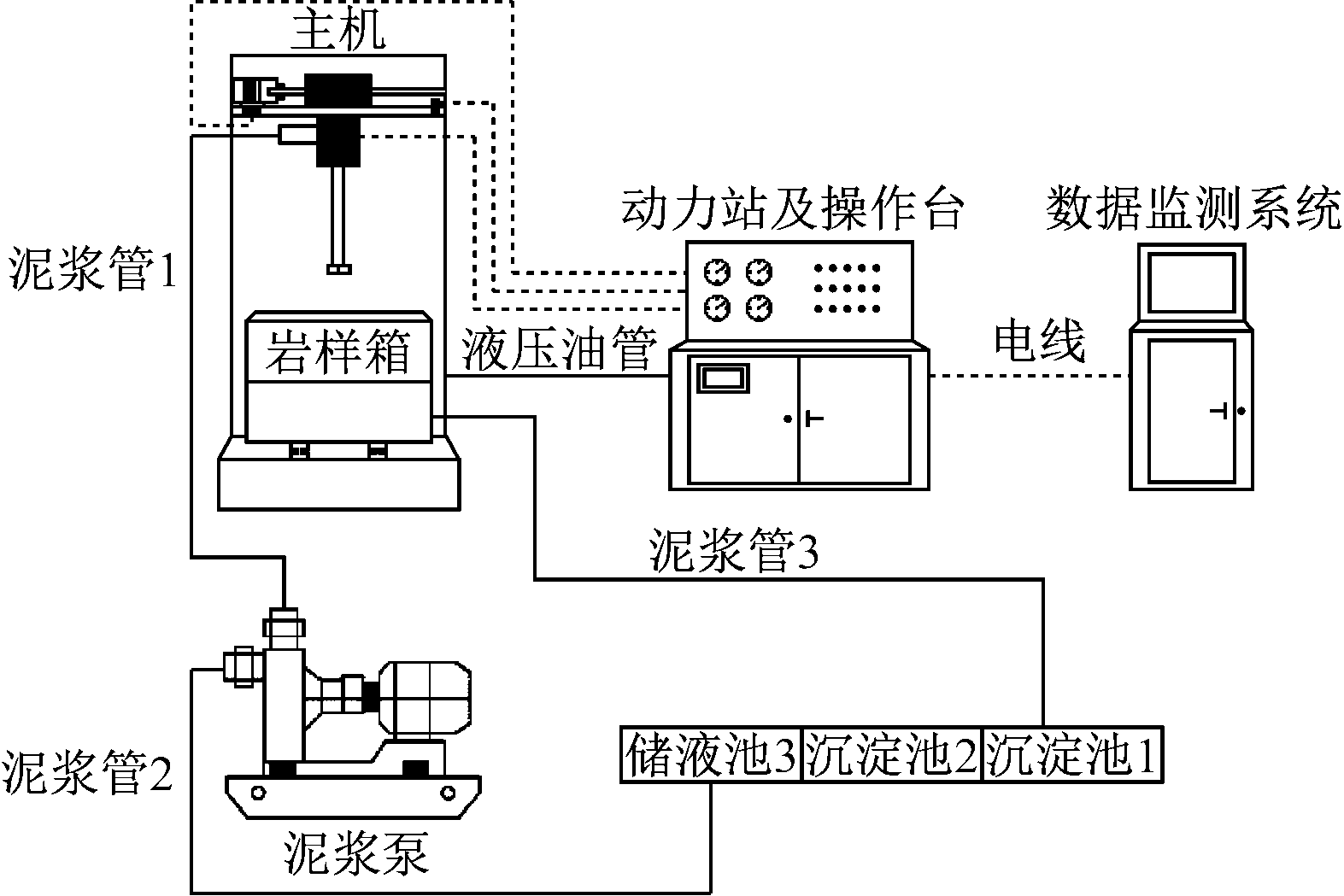 钻进试验台主要由主机、动力站及操作台、数据监测系统、泥浆泵等部分组成,如图2所示。主机采用门式框架结构,并集成液驱泥浆泵系统,系统最高压力为20 MPa,最大流量为104 L/min。系统可实时获得机械钻速、回转扭矩、钻压、转速、回转压力、泥浆泵流量6种钻进参数,作为研究的影响因素和识别数据来源[20-21]。