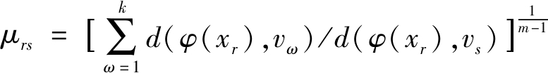式中:d(φ(xr),vω)为高维空间中第r个样本φ(xr)与第ω个聚类中心的距离度量,xr为第r项数据集,r=1,2,…,N;vs为高维特征空间中第s类的聚类中心,s=1,2,…,k。