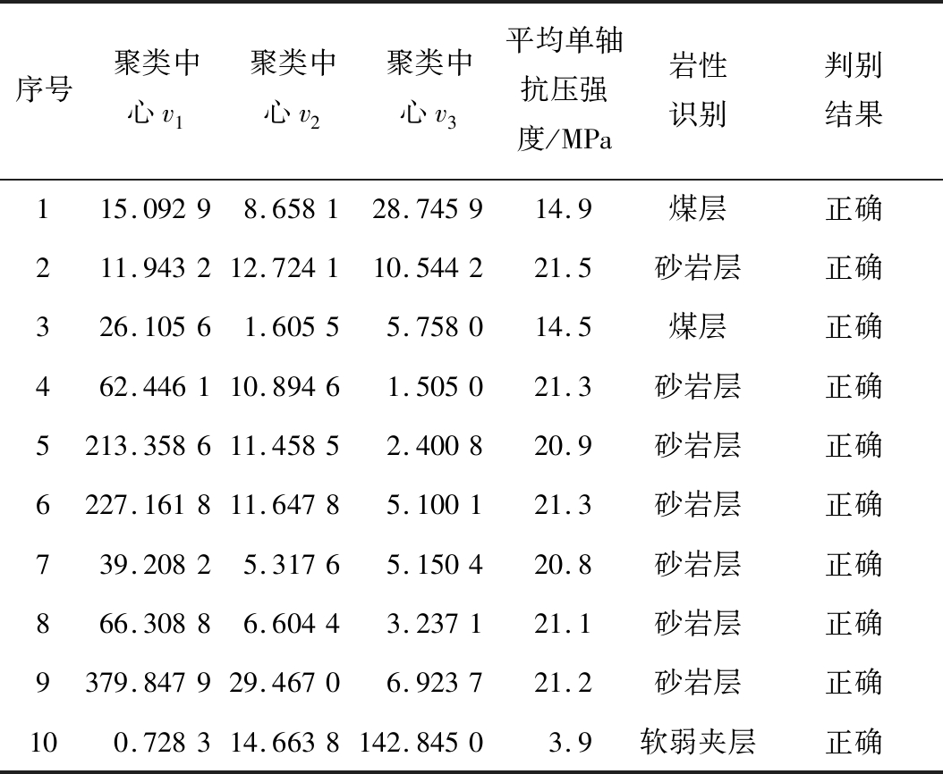 序号聚类中心v1聚类中心v2聚类中心v3平均单轴抗压强度/MPa岩性识别判别结果115.09298.658128.745914.9煤层正确211.943212.724110.544221.5砂岩层正确326.10561.60555.758014.5煤层正确462.446110.89461.505021.3砂岩层正确5213.358611.45852.400820.9砂岩层正确6227.161811.64785.100121.3砂岩层正确739.20825.31765.150420.8砂岩层正确866.30886.60443.237121.1砂岩层正确9379.847929.46706.923721.2砂岩层正确100.728314.6638142.84503.9软弱夹层正确