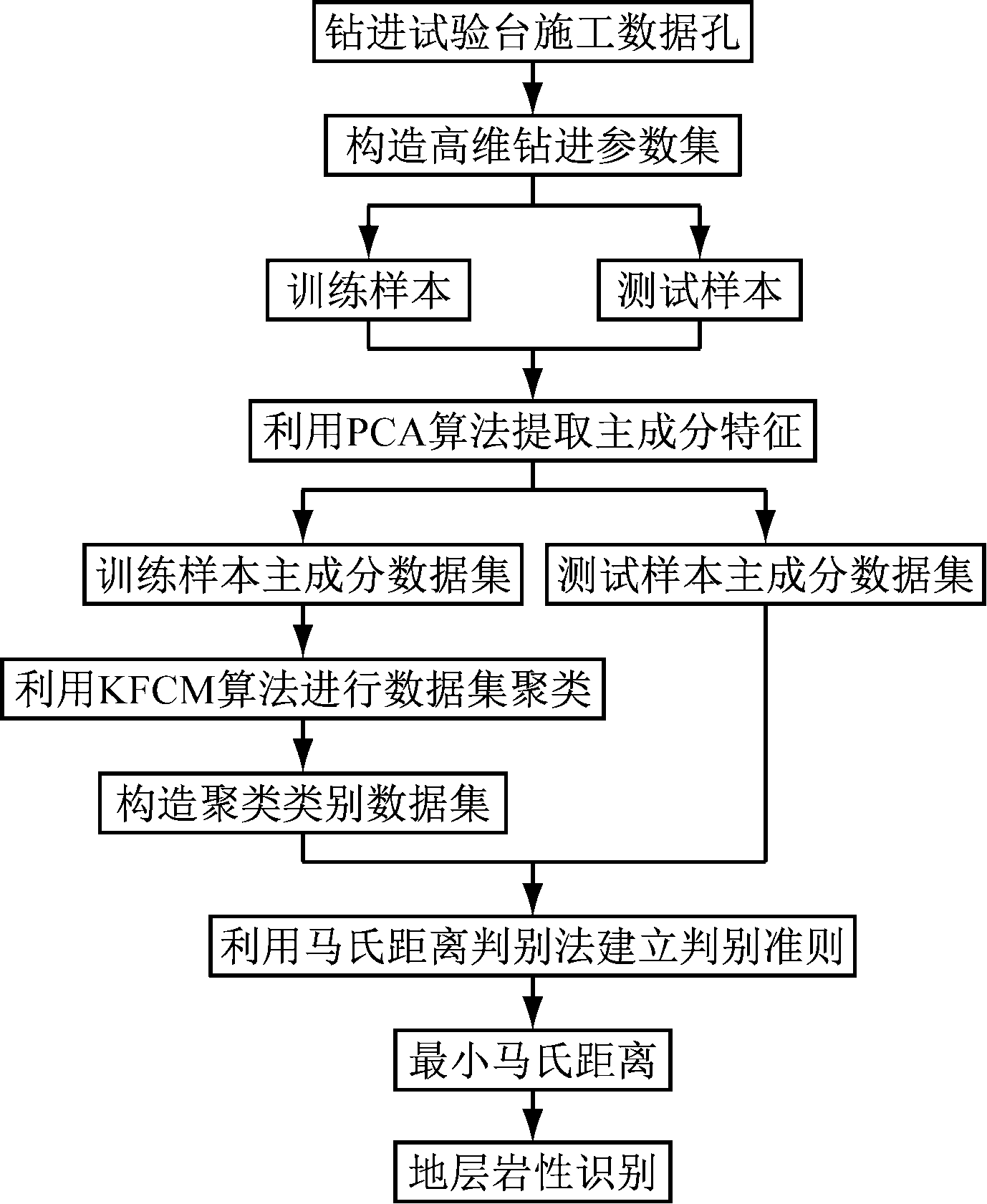 结合PCA算法的特征提取优势和KFCM算法具有较好聚类效果的特点,建立了基于PCA-KFCM算法的岩性识别模型,该模型首先利用PCA算法对高维数据集进行特征参数提取和数据降维处理,然后利用KFCM算法对主成分数据集进行聚类分析,最后通过马氏距离判断法建立判别准则,利用最小马氏距离完成对测试样本的地层岩性识别。岩性识别流程如图1所示。