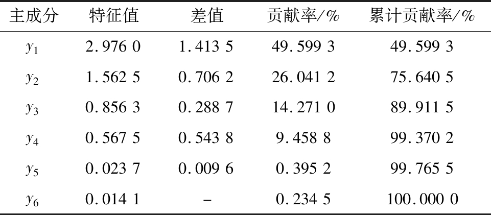 主成分特征值差值贡献率/%累计贡献率/%y12.97601.413549.599349.5993y21.56250.706226.041275.6405y30.85630.288714.271089.9115y40.56750.54389.458899.3702y50.02370.00960.395299.7655y60.0141-0.2345100.0000
