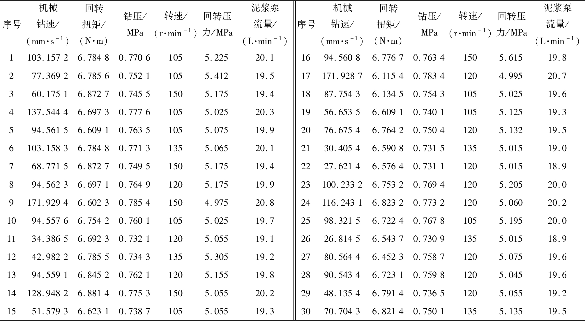 序号机械钻速/(mm·s-1)回转扭矩/(N·m)钻压/MPa转速/(r·min-1)回转压力/MPa泥浆泵流量/(L·min-1)序号机械钻速/(mm·s-1)回转扭矩/(N·m)钻压/MPa转速/(r·min-1)回转压力/MPa泥浆泵流量/(L·min-1)1103.15726.78480.77061055.22520.11694.56086.77670.76341505.61519.8277.36926.78560.75211055.41219.517171.92876.11540.78341204.99520.7360.17516.87270.74551505.17519.41887.75436.13450.75431055.02519.64137.54446.69730.77761055.02520.31956.65356.60910.74011055.12519.3594.56156.60910.76351055.07519.92076.67546.76420.75041205.13219.56103.15836.78480.77131355.06520.12130.40546.59080.73151355.01519.0768.77156.87270.74951505.17519.42227.62146.57640.73111205.01518.9894.56236.69710.76491205.17519.923100.23326.75320.76941205.20520.09171.92946.60230.78541504.97520.824116.24316.82320.77321205.06020.21094.55766.75420.76011055.02519.72598.32156.72240.76781055.19520.01134.38656.69230.73211205.05519.12626.81456.54370.73091355.01518.91242.98226.78550.73431355.30519.22780.56446.45230.75871205.07519.61394.55916.84520.76211205.15519.82890.54346.72310.75981205.04519.614128.94826.88140.77531505.05520.22948.13546.79140.73651205.05519.21551.57936.62310.73871055.05519.33070.70436.82140.75011355.13519.5