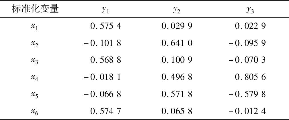 标准化变量y1y2y3x10.57540.02990.0229x2-0.10180.6410-0.0959x30.56880.1009-0.0703x4-0.01810.49680.8056x5-0.06680.5718-0.5798x60.57470.0658-0.0124
