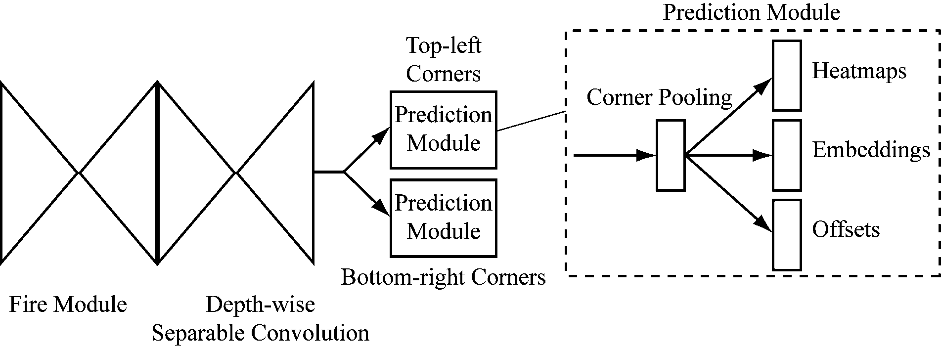 利用深度学习网络进行目标检测时,每个检测框只能检测1个目标,如果2个目标同时落在1个检测框中,也只能检测到1个目标。通过引入anchor boxes可实现多目标检测,但增加了深度学习网络的复杂程度,导致训练过程收敛速度慢、网络计算能力降低等问题[6-7]。深度学习网络CornerNet只需通过检测bounding box的左上角关键点和右下角关键点来实现目标检测,消除了对anchor boxes的需求。但CornerNet网络在COCO数据集上测试的平均单帧推理时间为1.147 s[8],不能满足实时性要求。