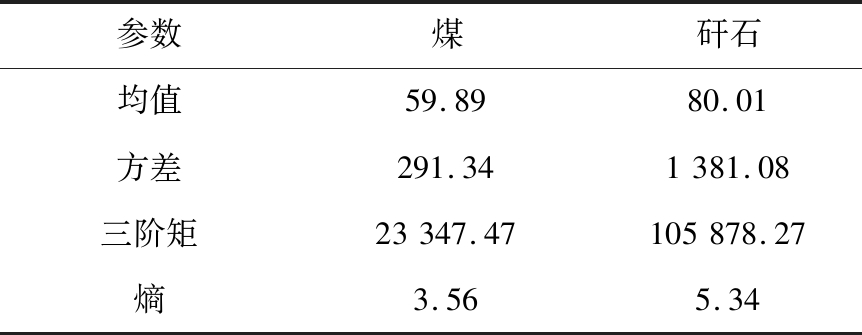 参数煤矸石均值59.8980.01方差291.341381.08三阶矩23347.47105878.27熵3.565.34