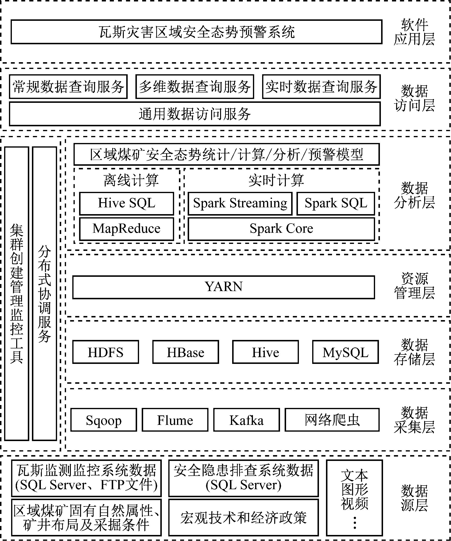 数据分析层:根据构建的区域预警指标体系和模型,建立瓦斯灾害区域煤矿安全态势预警算法,使用MapReduce、HiveSQL来查询、统计、计算不同区域不同煤矿的大规模离线数据,使用Spark Streaming、Spark SQL来查询、统计、计算不同区域不同煤矿的实时数据。