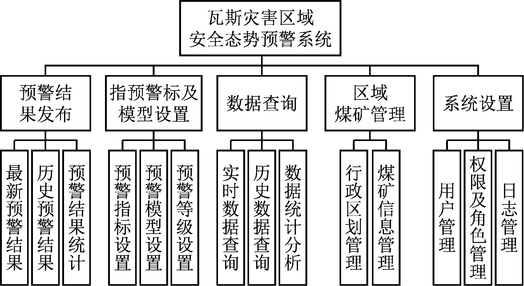 软件应用层:预警系统主要包括预警结果发布、预警指标及模型设置、数据查询、区域煤矿管理、系统设置等功能模块,功能结构如图4所示,瓦斯灾害区域安全态势预警系统界面如图5所示,其他层级预警界面通过点击地图向下钻取即可显示。