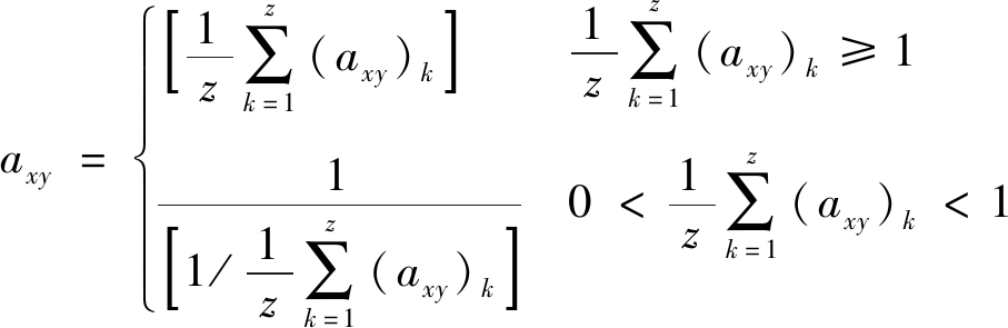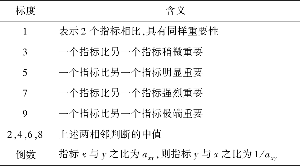 多专家评估具体方法:设参与两指标相对重要性评估的专家数为z,第k个专家给出的重要性之比为(axy)k,打分标准见表2。