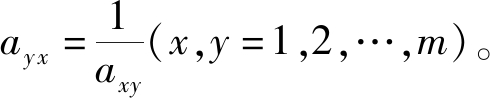 (1) 构造下一层对上一层的判断矩阵Α=(axy)m×m,表示针对某一上层指标,其下一层所有指标的相对重要性的比较,该矩阵为正互反矩阵,其中m为矩阵的阶数,即下一层指标个数;axy为下一层指标x与指标y重要性之比,其值采用多专家评估的方式,按照Santy标度法[11-12]给出,其值满足如下条件:axy>0,