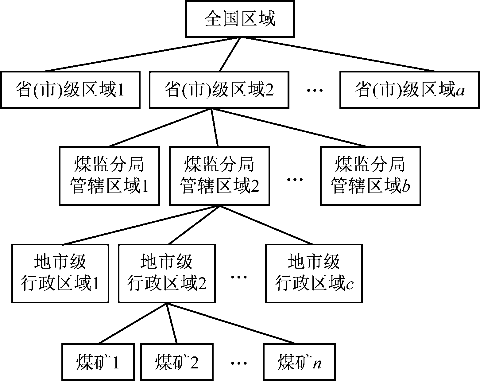 根据我国煤矿监管监察行政管理模式及预警的需要,将预警区域划分为全国区域、省(市)级区域、煤监分局管辖区域、地市级行政区域4个区域层级,如图1所示,其中煤矿是构成区域的最小单元,a,b,c,n为对应区域或煤矿的数量。