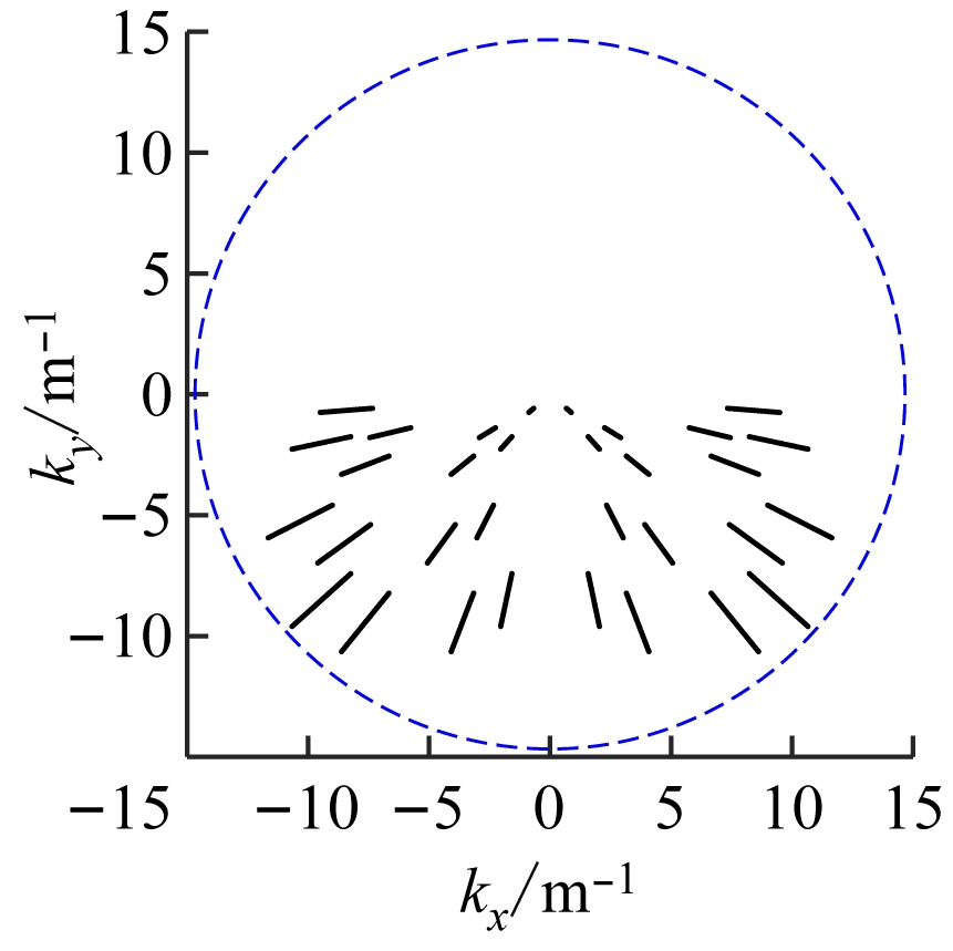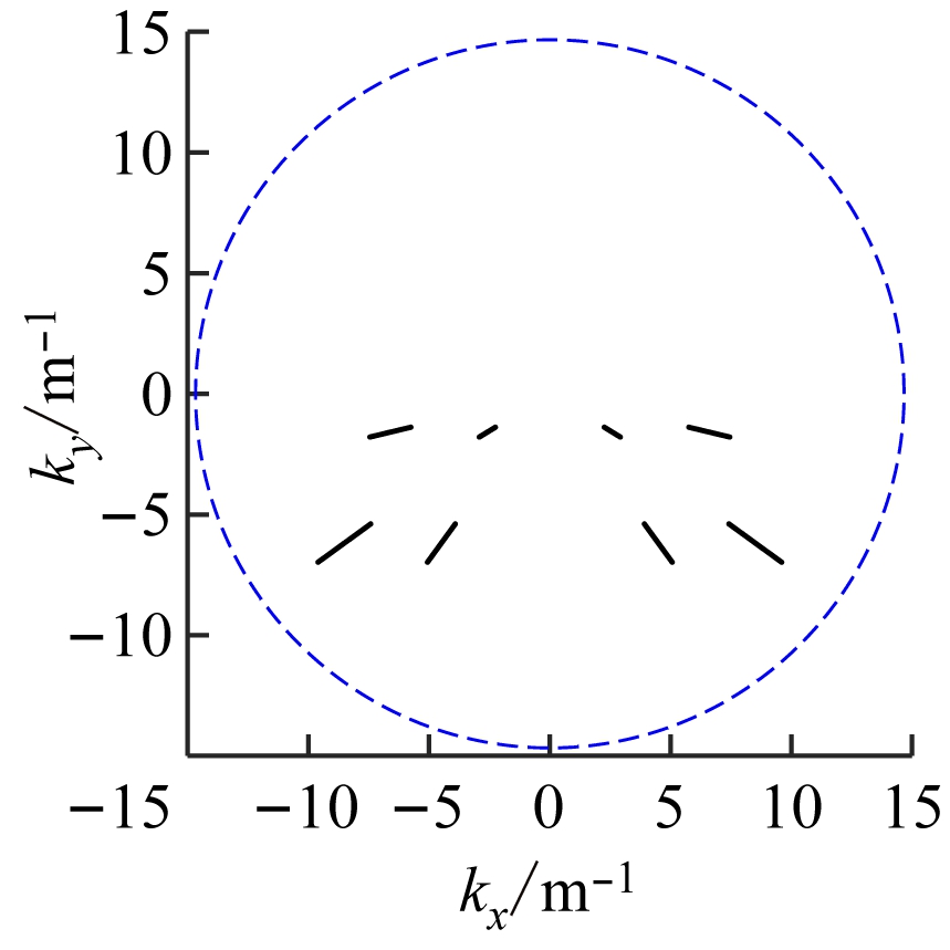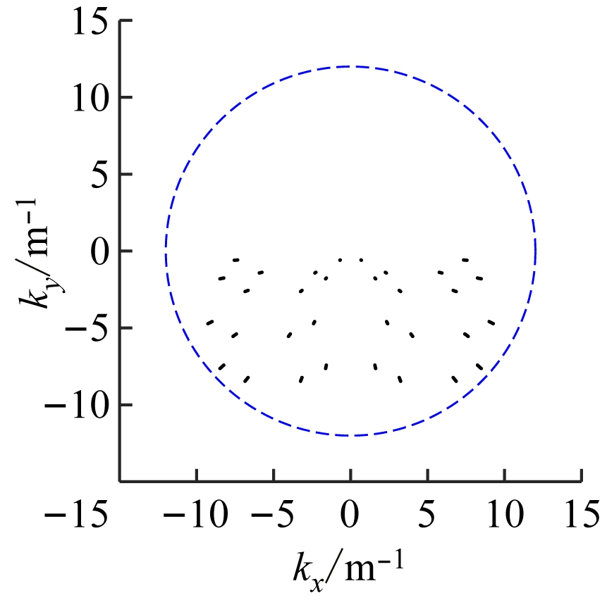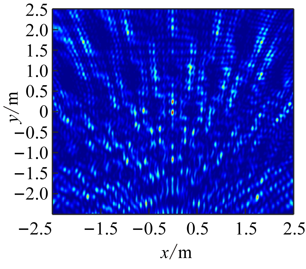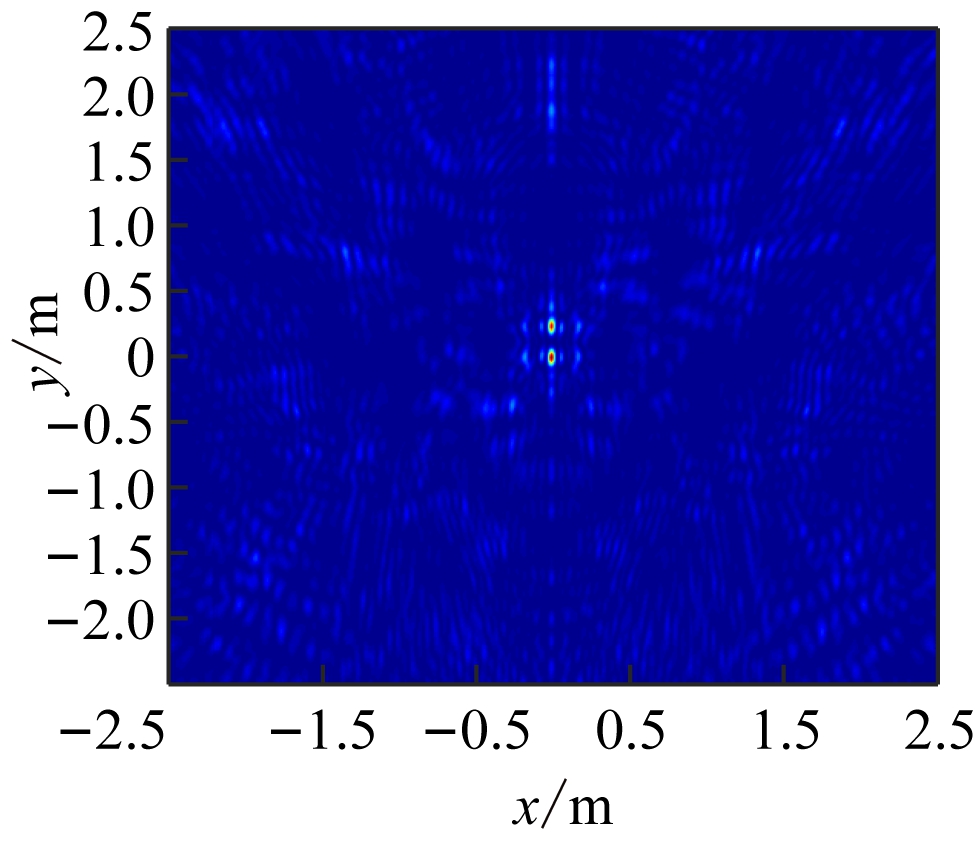 从图6可看出,通过空间和频率分集联合,波数域覆盖范围扩展到整个kx轴和ky下半轴且较密集,使定位结果的分辨率得到显著提高,去除了虚像和重影,实现了目标准确定位。