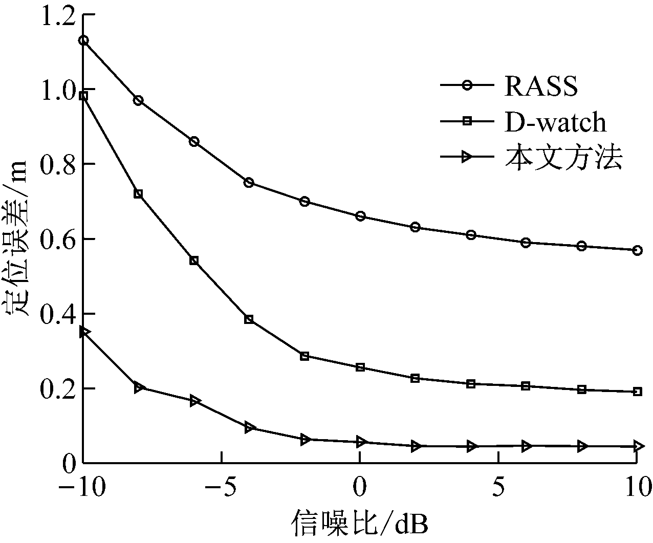将本文方法与RASS[13] 、D-watch[9]进行对比,分别进行100次仿真实验,得到3种方法的定位误差,如图9所示。RASS是一种基于RSS(Received Signal Stength,接收信号强度)变化的指纹定位方法,由于RSS为粗粒度信息,对距离并不敏感,所以RASS方法定位误差较大。D-watch通过AOA(Angle-of-Arrival,到达角度)峰值变化检测目标角度信息,因存在密集多径干扰,导致定位精度低。而本文方法不仅利用了细粒度的相位信息,还通过分集进一步提升了定位精度,当信噪比为-10 dB时,定位误差小于0.4 m。