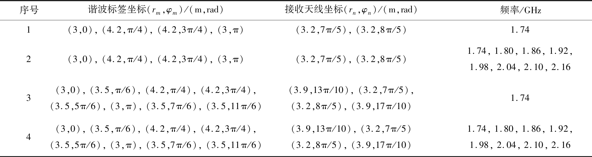 序号谐波标签坐标(rm,φm)/(m,rad)接收天线坐标(rn,φn)/(m,rad)频率/GHz1(3,0),(4.2,π/4),(4.2,3π/4),(3,π)(3.2,7π/5),(3.2,8π/5)1.742(3,0),(4.2,π/4),(4.2,3π/4),(3,π)(3.2,7π/5),(3.2,8π/5)1.74,1.80,1.86,1.92,1.98,2.04,2.10,2.163(3,0),(3.5,π/6),(4.2,π/4),(4.2,3π/4),(3.5,5π/6),(3,π),(3.5,7π/6),(3.5,11π/6)(3.9,13π/10),(3.2,7π/5),(3.2,8π/5),(3.9,17π/10)1.744(3,0),(3.5,π/6),(4.2,π/4),(4.2,3π/4),(3.5,5π/6),(3,π),(3.5,7π/6),(3.5,11π/6)(3.9,13π/10),(3.2,7π/5)(3.2,8π/5),(3.9,17π/10)1.74,1.80,1.86,1.92,1.98,2.04,2.10,2.16