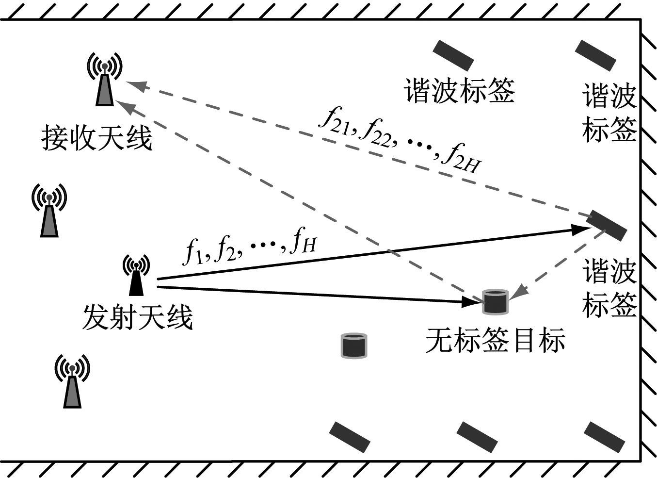 由谐波标签发出的二次谐波信号经无标签目标反向散射后到达接收天线。接收天线得到单频和单标签下的一次定位结果,该结果是不准确的。重复上述定位过程,将获得多个标签和多个频率下的定位结果,即通过空间和频率分集联合,融合多通道信息,实现准确定位。