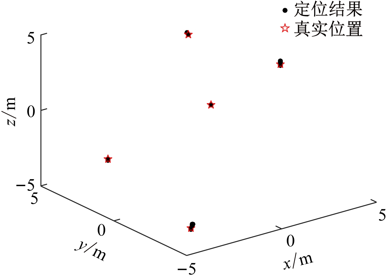 将仿真实验拓展到三维,采用8个标签、4个接收天线和8个频率,在5 m×5 m×5 m(长×宽×高)场景下选取5个目标点,定位结果如图8所示。