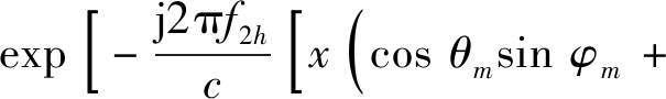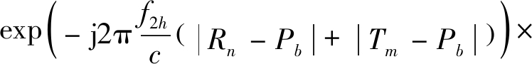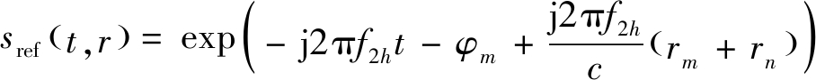 图2中,Rn=(rn, θn, φn)和Tm=(rm, θm, φm)分别为第n个接收天线和第m个谐波标签的球面位置坐标,Pb=(r,θ,φ)为第b个目标散射点坐标。rn, θn, φn分别为第n个接收天线距原点距离、俯仰角和方位角;rm, θm, φm分别为第m个谐波标签距原点距离、俯仰角和方位角;r,θ,φ分别为目标散射点距原点距离、俯仰角和方位角。为了分析方便,假设不存在直达波及其他多径干扰,只有目标回波信号。发射天线发射基频查询信号ah(t),谐波标签被唤醒并响应查询信号,产生并发射二次谐波信号: